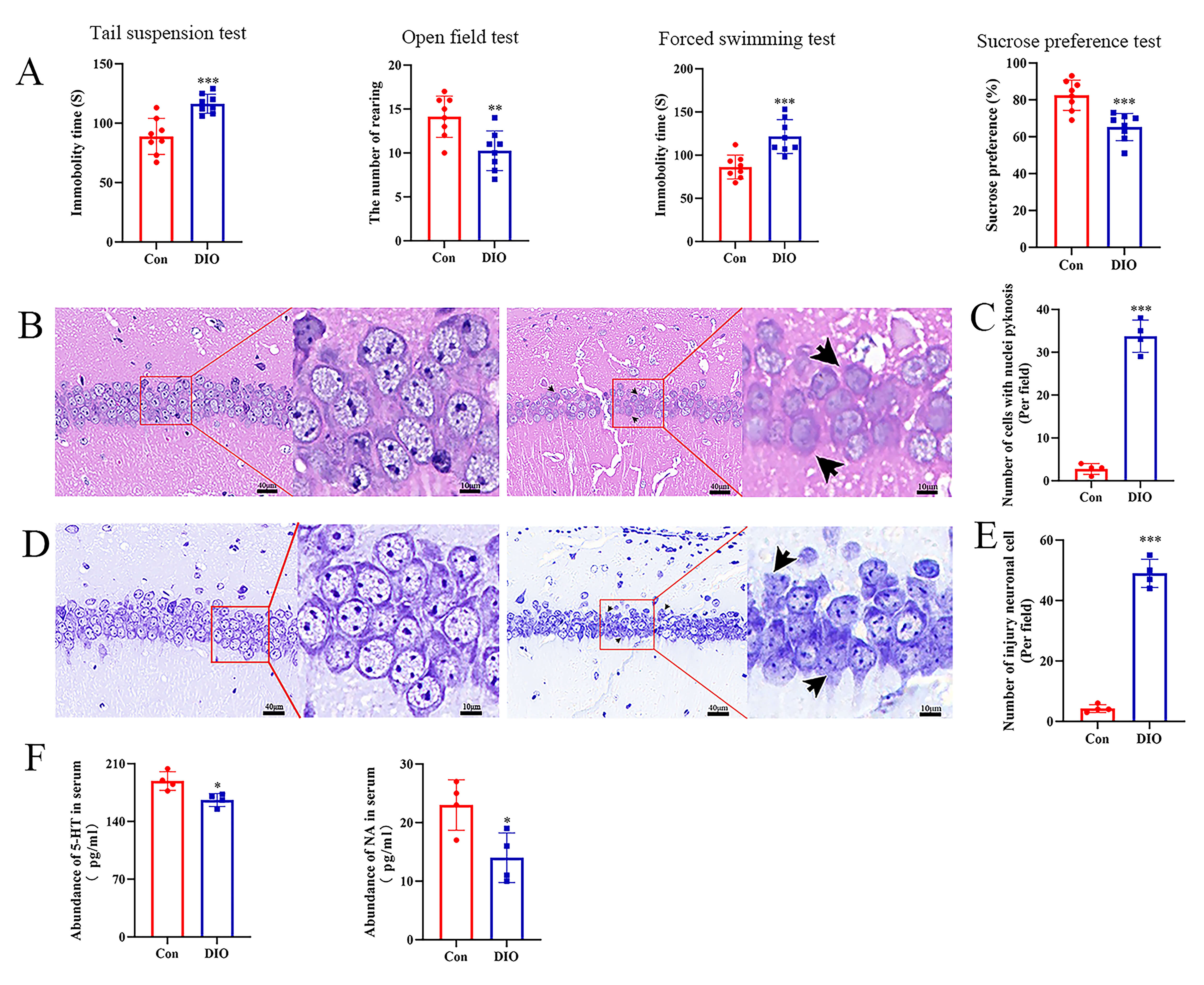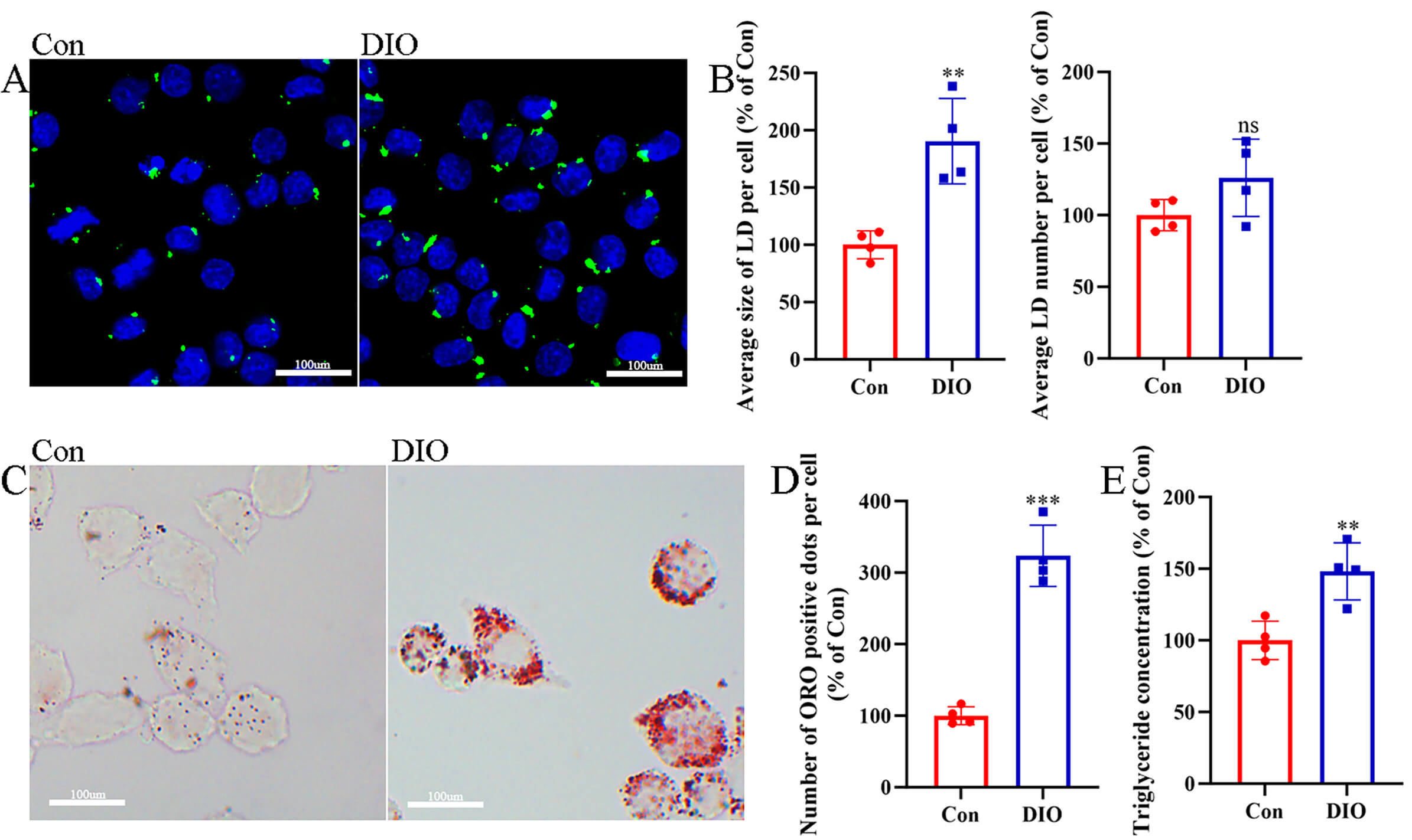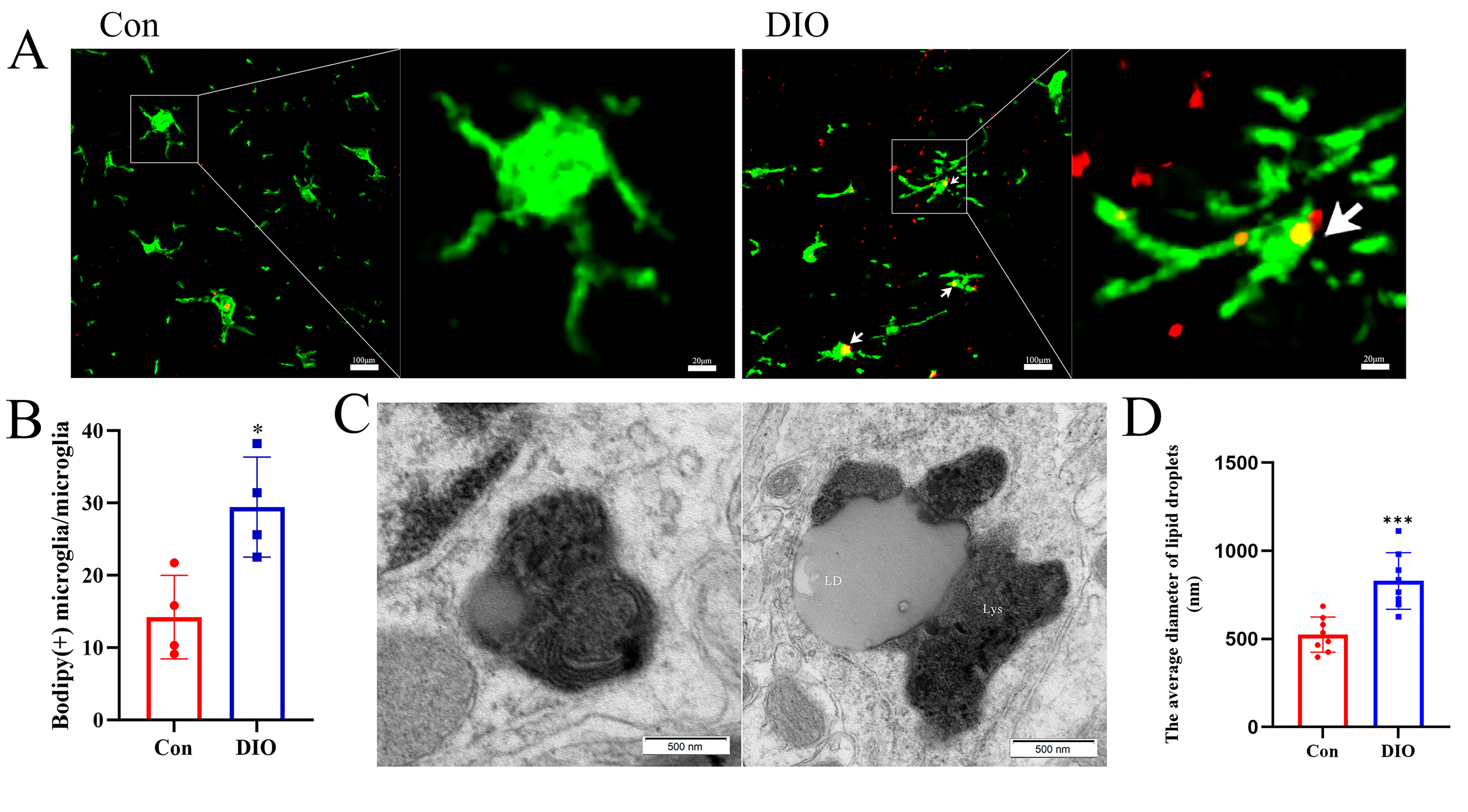 Compared with Con mice, DIO mice exhibited significant depressive-like behaviors and hippocampal neuronal damage, accompanied by enhanced microglia-mediated neuroinflammation. In the co-culture system, microglia from DIO mice demonstrated increased neurotoxicity toward hippocampal neurons. Bodipy staining and electron microscopy revealed increased accumulation of LDs in the hippocampal microglia of DIO mice. This was further confirmed in glial cells in vitro. Lipidomic profiling identified substantial disturbances in lipid metabolism in DIO microglia.
