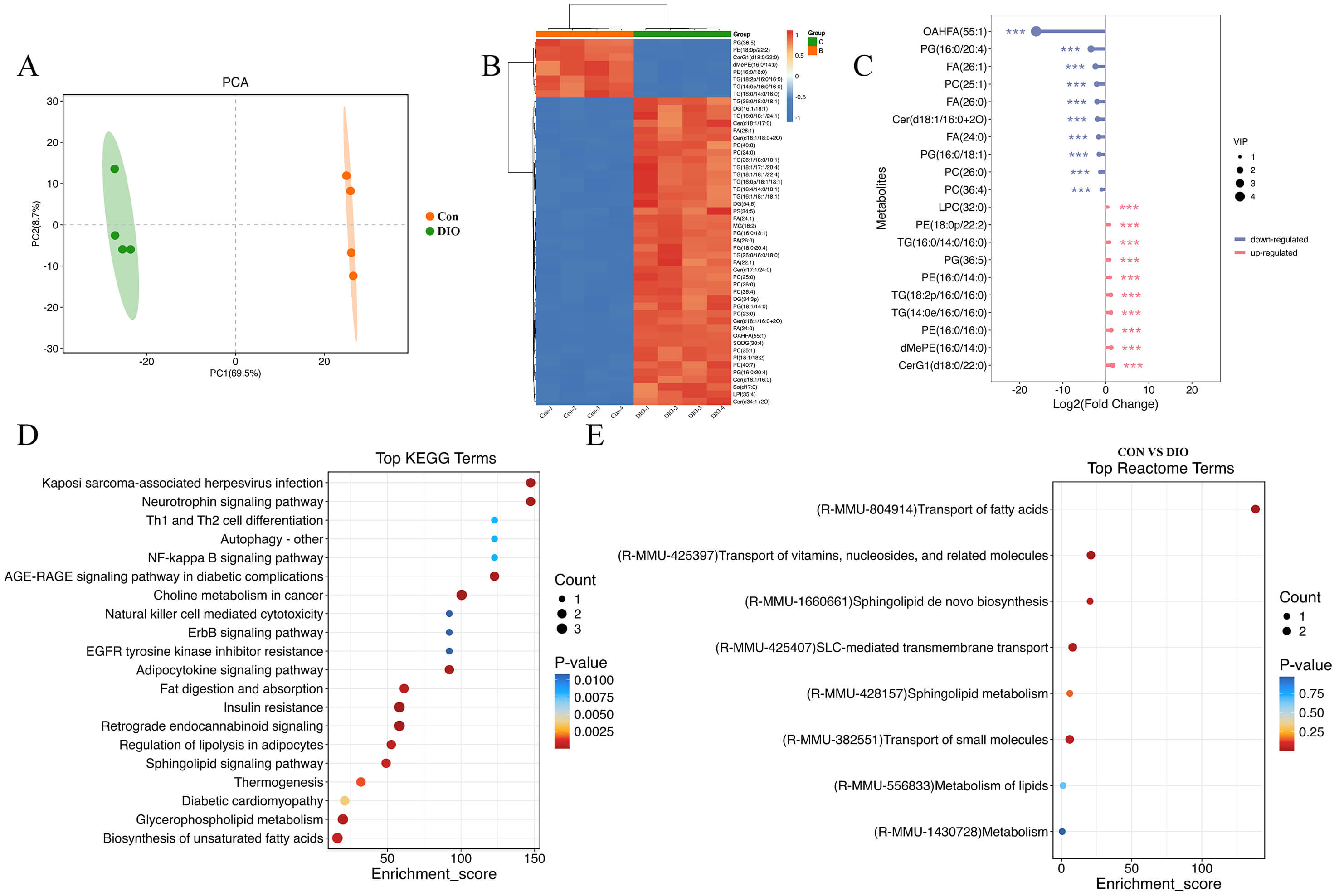 Lipidomic profiling of glial cells from DIO mice. (A) PCA analysis of untargeted lipidomics. (B) Heatmap analysis of differential metabolites. (C) Visualization of differential metabolites with a lollipop plot. (D) KEGG pathway enrichment analysis. (E) Reactome pathway enrichment analysis. PCA, principal component analysis; KEGG, Kyoto Encyclopedia of Genes and Genomes.