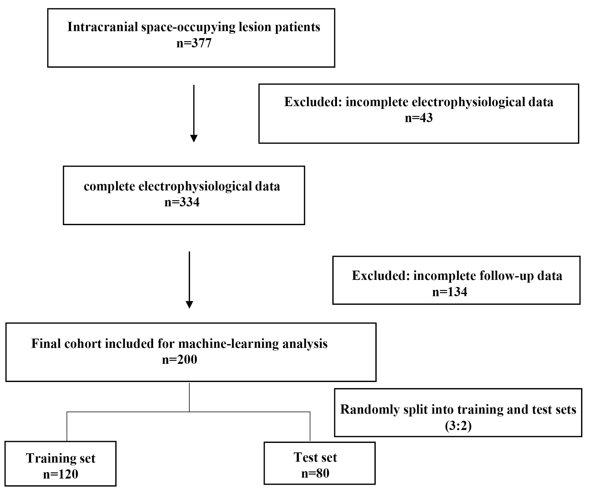Patients were excluded if electrophysiological data were incomplete or technically inadequate (n = 43) or if follow-up data were missing or insufficient for the assessment of outcome (n = 134). After applying these criteria, a final cohort of 200 patients was included in the analysis. The patient selection process and data filtering steps are shown in the study flowchart (Fig. 1).