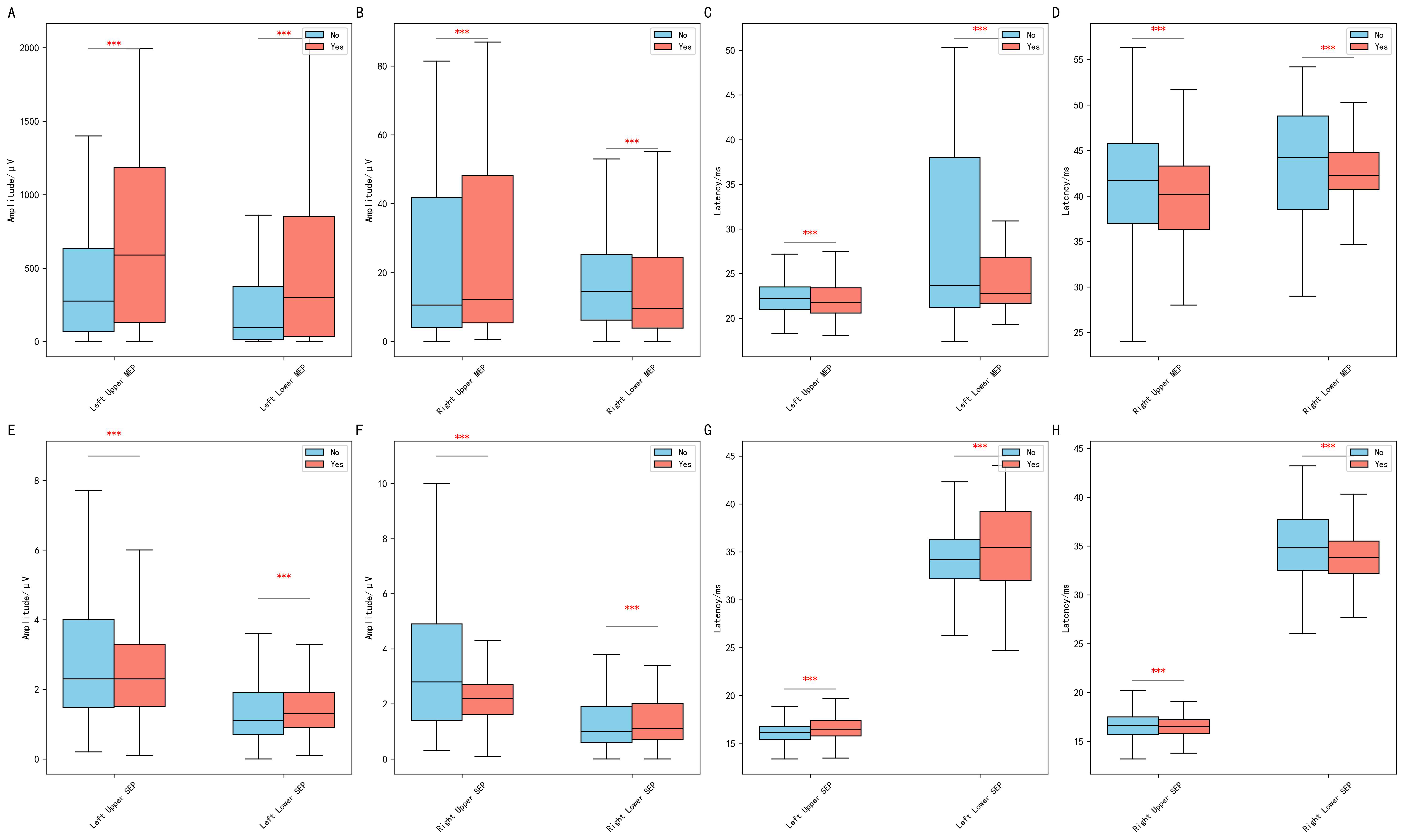 left and right limbs, respectively. (C,D) Comparison of SEP latency between the