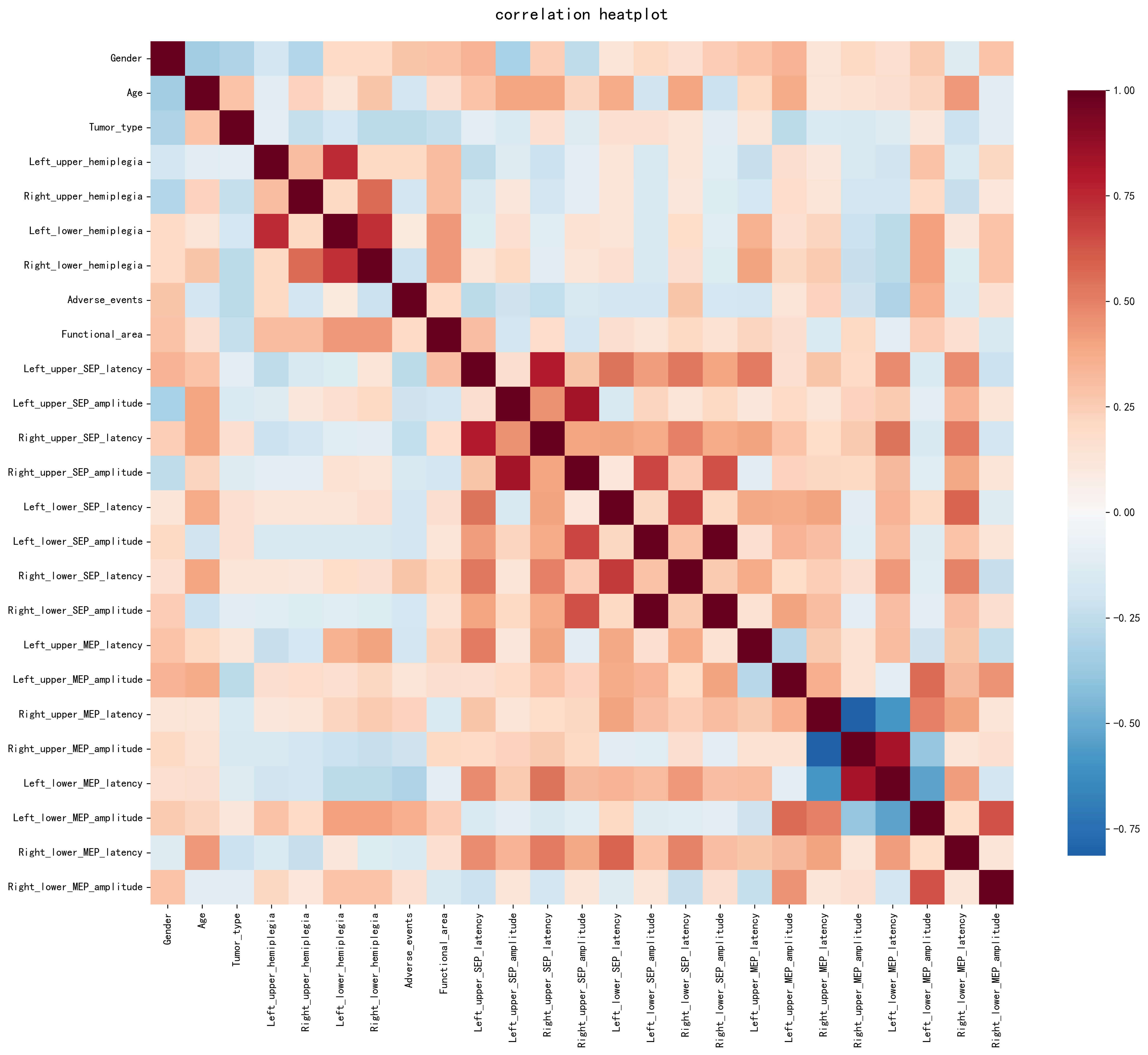 Correlation analysis of MEP and SEP. The heatmap illustrates pairwise correlations between baseline clinical variables, lesion involvement in functional brain areas, serious adverse events, and quantitative SEP and MEP parameters. The color intensity reflects the strength and direction of correlations, with red indicating positive correlations and blue indicating negative correlations. SEP and MEP parameters show differential correlation patterns with lesion localization and postoperative adverse outcomes.