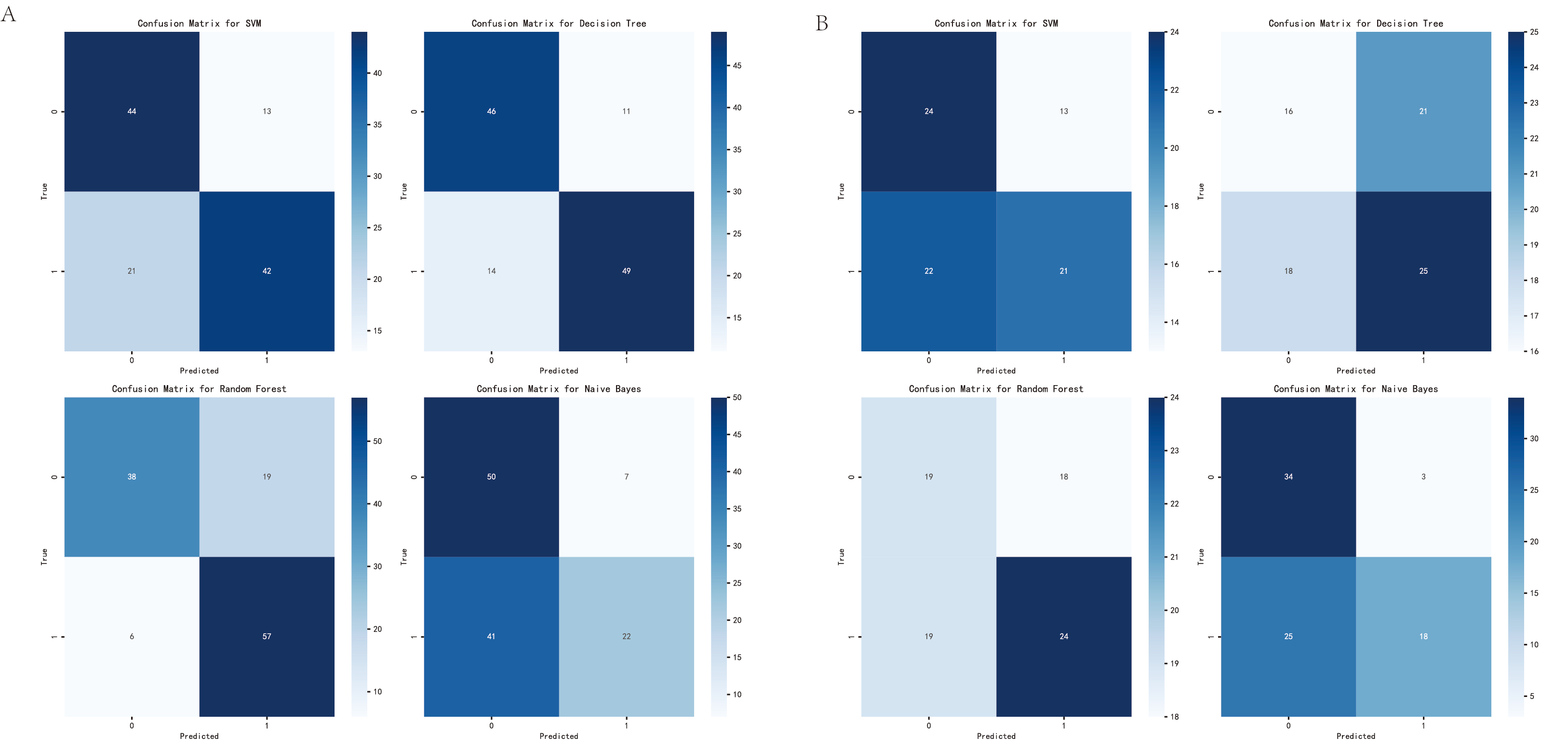 Prediction of serious adverse events. (A) Confusion matrices of the support vector machine, decision tree, random forest, and naïve Bayes models in the training set for predicting serious adverse events. (B) Confusion matrices of the same models in the independent test set. The matrices show the distribution of true-positive, true-negative, false-positive, and false-negative predictions for each model in classifying serious adverse events.