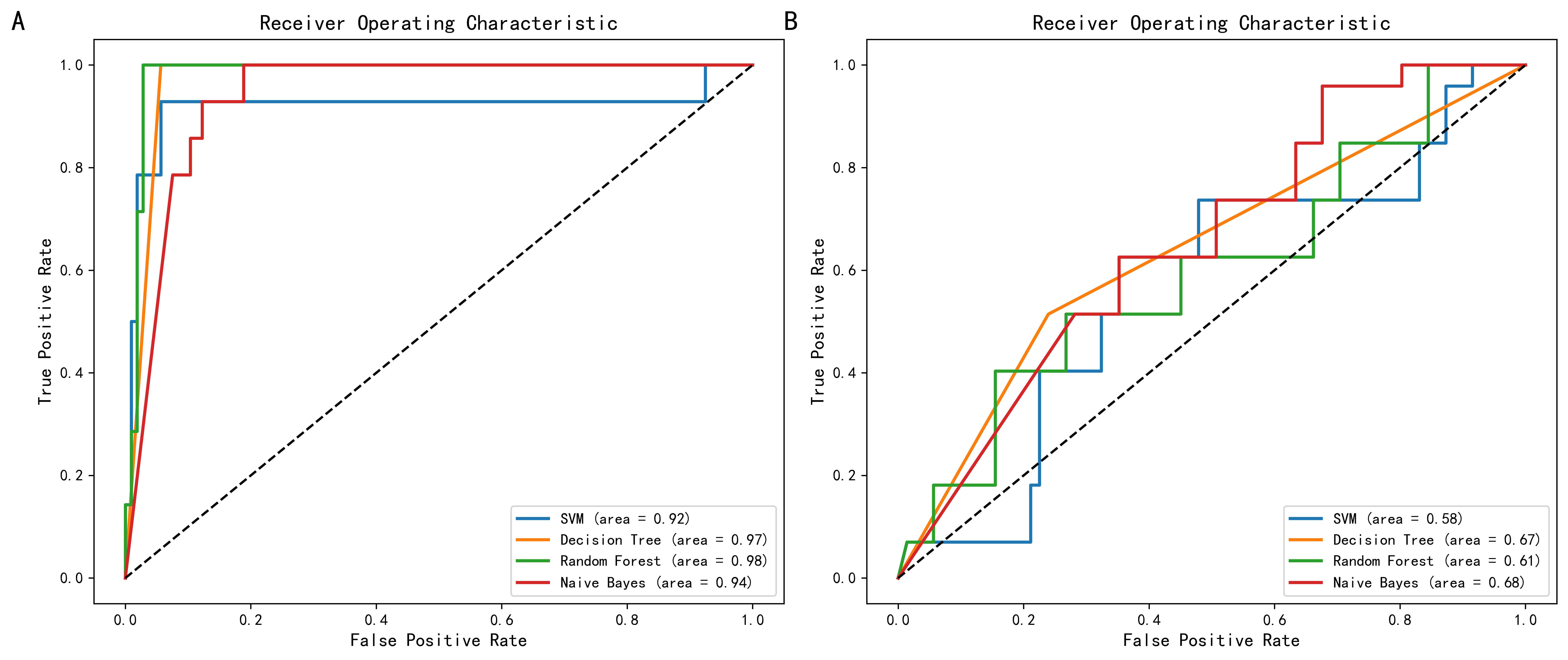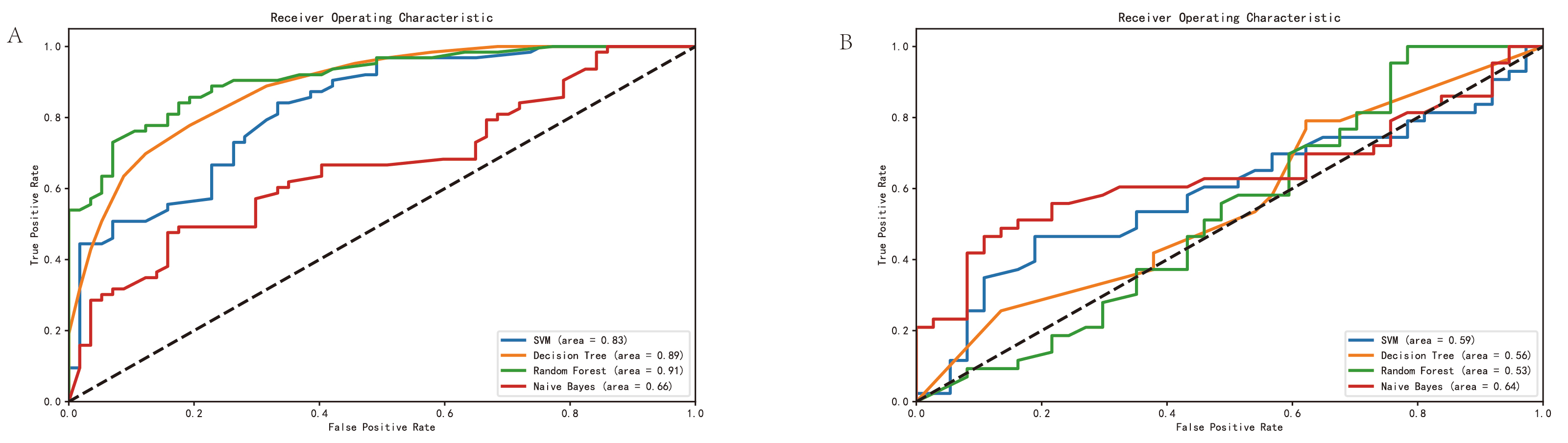 ROC curves of functional area. (A) ROC curves of the support vector machine, decision tree, random forest, and naïve Bayes models in the training set. (B) ROC curves of the same models in the independent test set. The ROC curves illustrate the trade-off between sensitivity and specificity across different classification thresholds. The AUC for each model is indicated in the legend. ROC, receiver operating characteristic.