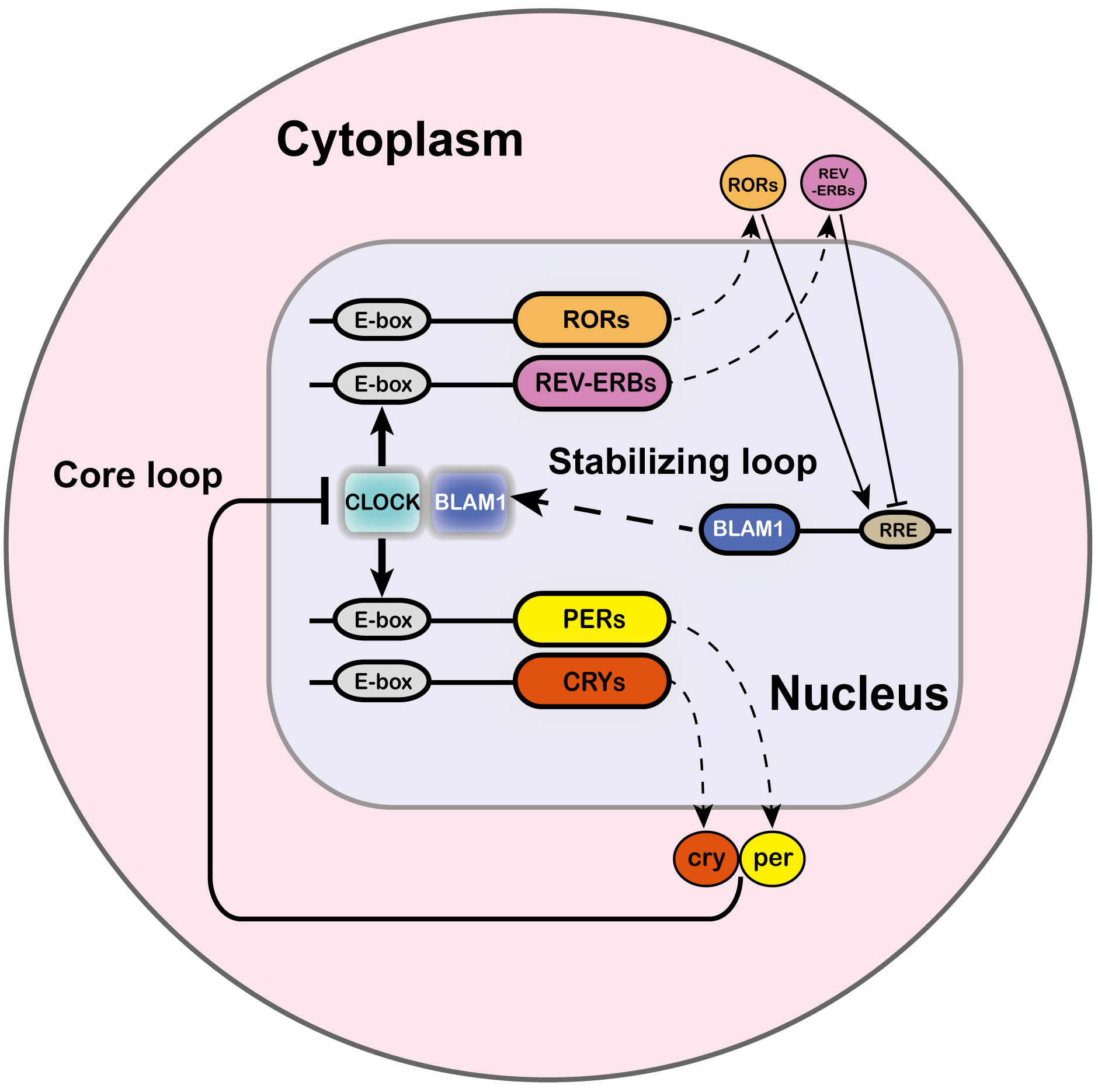of a core feedback loop and a stabilizing loop. Within the core circadian loop,