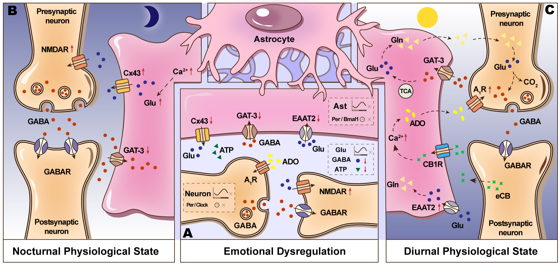 A1R, adenosine A1 receptor; A2AR, Adenosine A2A receptor; ACC, anterior cingulate cortex; ADK, adenosine kinase; Aldh1l1, Aldehyde dehydrogenase 1 family member L1; AQP4, aquaporin-4; ATP, Adenosine triphosphate; AVP, arginine vasopressin; BD, bipolar disorder; BDNF, brain-derived neurotrophic factor; BF, basal forebrain; Bhlhe40, Basic helix-loop-helix family member e40; BLA, basolateral amygdala; BMAL1, brain and muscle ARNT-like 1; CA1, Cornu Ammonis 1; CBR, cannabinoid receptors; CD39, cluster of differentiation 39; CeM, centromedial amygdala; cHCs, cones and horizontal cells; ChR2, Channelrhodopsin-2; CLOCK, circadian locomotor output cycles kaput; cN-II, cytosolic 5′-nucleotidase; CREB, cAMP response element-binding protein; CRY1, Cryptochrome 1; Cx30, Connexin 30; Cx43, connexin 43; DA, dopamine; dACC, dorsal anterior cingulate cortex; dlPFC, dorsolateral prefrontal cortex; Drd3, dopamine receptor D3; DRN, dorsal raphe nucleus; EAATs, excitatory amino acid transporters; EPM, elevated plus maze; FST, forced swim test; GABA,