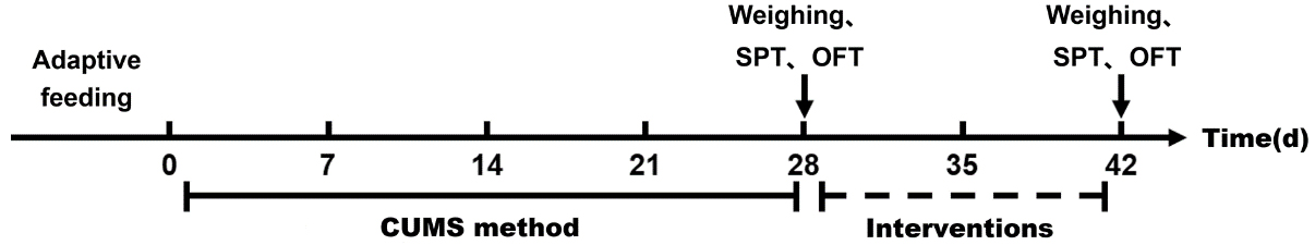 The rats in the beaker were placed on an electronic balance with a tray, and their weight was recorded. The testing time points are on day 28, corresponding to the CUMS modeling period, and day 42, corresponding to the intervention period.