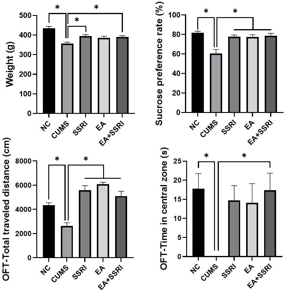 After the modeling, except the normal control group (NC, n = 13), the rats in the modeling group were divided into 4 groups according to the random number table: The model group (CUMS, n = 13), paroxetine group (SSRI, n = 13), EA group (EA, n = 13), and EA combined with paroxetine group (EA+SSRI, n = 13).