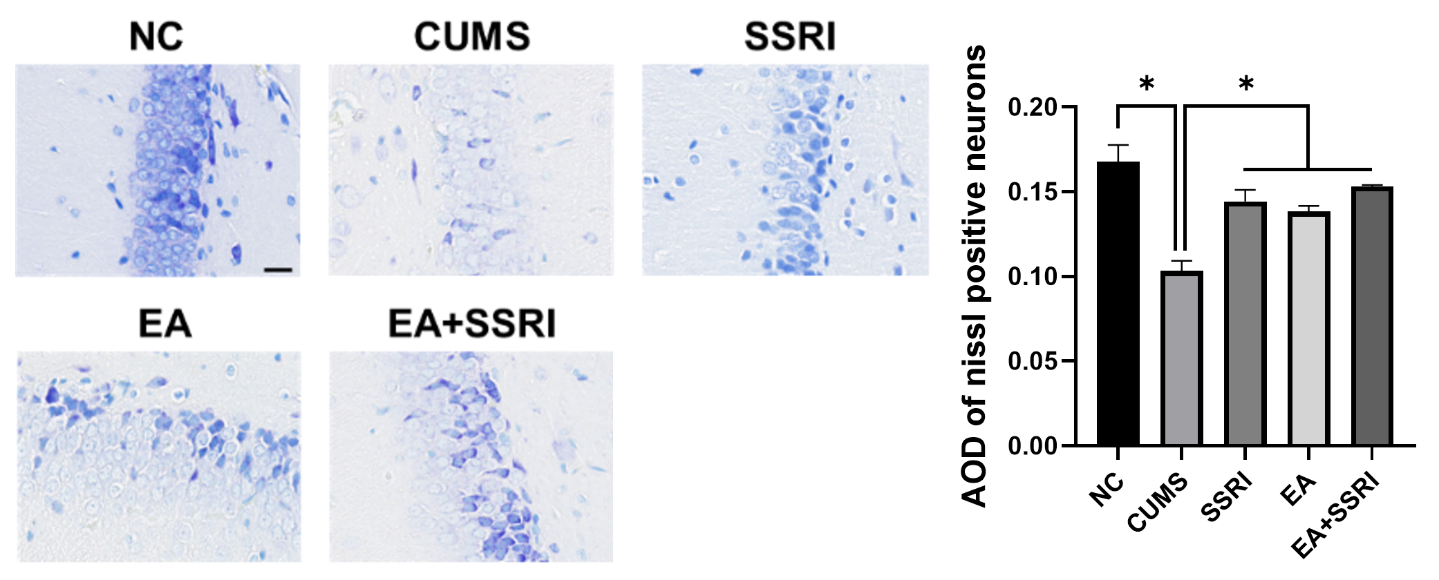 We focused on the neuronal damage in the hippocampal DG region. The hippocampus is considered a diagnostic neurobiological biomarker and a therapeutic target for depression [48]. Studies have shown that the hippocampus is one of the targeted brain regions in EA intervention for depression patients [49]. Nissl staining is a neuronal-specific staining, and the intensity of staining (AOD) is positively correlated with the number of neurons in the brain region. Nissl staining was performed on the DG region of the rat hippocampus to observe the number of neurons and evaluate the extent of damage. Critically, the arrangement and density of neurons reflect the structural basis for neural connectivity and function. The disorganized architecture observed in CUMS rats suggests impaired neurogenesis, disrupted synaptic integration, and compromised information processing within the hippocampal formation, which are key mechanistic deficits in depression [50, 51]. We found that the depressive rats had disorganized and loose hippocampal DG neuronal arrangements, and after paroxetine, EA, or EA combined with paroxetine intervention, the number and arrangement of neurons were improved. Combined with the improvement in the macroscopic behavioral and microscopic hippocampal DG neuronal counts in CUMS-induced depressive rats, EA combined with paroxetine intervention was superior to EA or paroxetine alone.