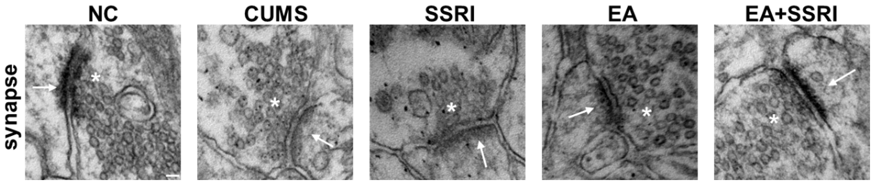 Transmission electron microscopy showed that the synaptic profile in the hippocampal DG region of the NC group rats was clear, with a wide and high-density postsynaptic density. In the CUMS group, the pre- and postsynaptic membrane contours were blurred, and the density of the postsynaptic density was decreased. Compared to the CUMS group, the SSRI and EA groups both exhibited a trend towards clearer synaptic contours and a postsynaptic density that appeared wider and more electron-dense. Among all groups, the EA+SSRI group consistently demonstrated the most pronounced improvement in these ultrastructural features (Fig. 4).