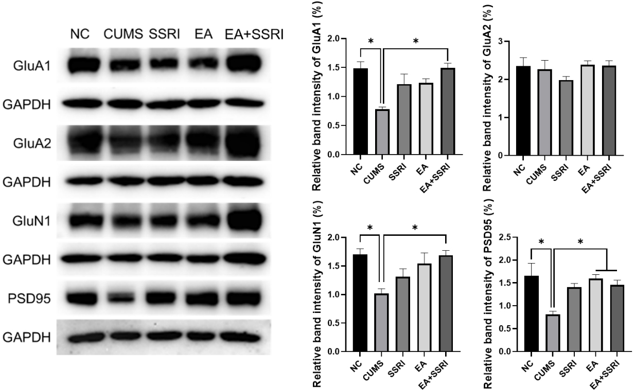 The evidence-based medical studies show that the clinical efficacy of electroacupuncture (EA) in the treatment of mild and moderate depression is comparable to that of antidepressants, with fewer adverse reactions and high safety [9, 10]. Conventional antidepressant medications, particularly commonly used drugs such as Selective Serotonin Reuptake Inhibitors (SSRIs), are often accompanied by a range of side effects, including nausea, weight gain, sexual dysfunction, insomnia, and drowsiness [11, 12]. These adverse effects frequently lead to reduced patient compliance, thereby compromising treatment outcomes. In contrast, EA, as a non-pharmacological therapy, demonstrates distinct advantages in the aspects mentioned above. Numerous studies have found that, compared with antidepressants alone, combining EA with antidepressants can accelerate the therapeutic effect and rapidly relieve symptoms [13, 14]. Our previous clinical trials also found that EA at Yintang (GV29) and Baihui (GV20) can shorten the onset time of paroxetine, one of the SSRIs, improve its clinical efficacy, and reduce side effects [15, 16]. The clinical efficacy of EA combined with paroxetine is superior to that of paroxetine alone and reduces its onset time [17]. Importantly, underlying these rapid clinical effects is the modulation at the synaptic level. Previous animal experiments were consistent with clinical trials, and showed that EA promoted rapid antidepressant action by modifying synaptic efficacy and architecture in the hippocampus [18]. Furthermore, synaptic structure changes are closely related to the molecular composition of the postsynaptic density, particularly the abundance of glutamate receptors such as AMPARs [19, 20, 21].