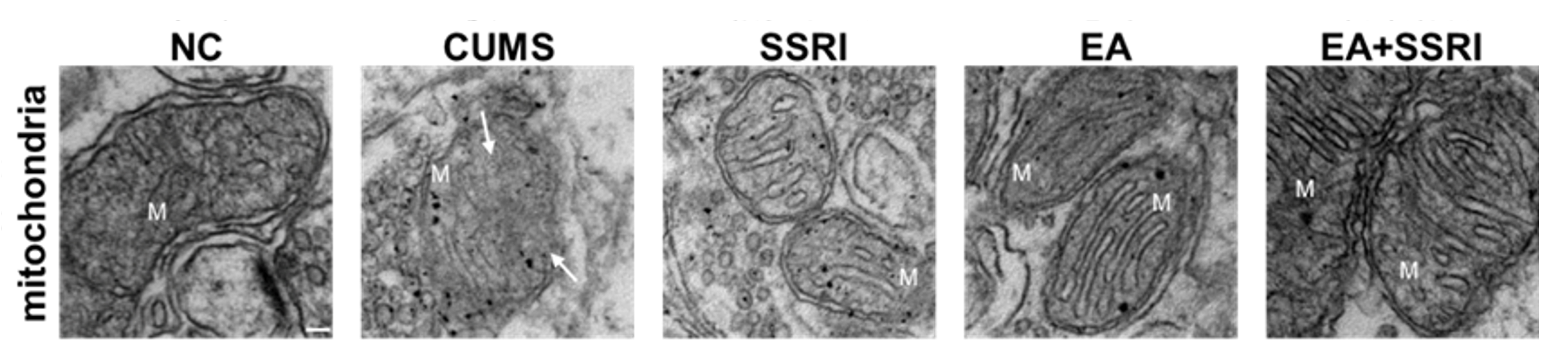 Transmission electron microscopy revealed distinct morphological trends across groups. Mitochondria in the NC group were predominantly elliptical with intact cristae. In contrast, the CUMS group predominantly exhibited smaller, swollen mitochondria with reduced, fragmented cristae, and occasional vacuolization. Compared to the CUMS group, the SSRI and EA groups showed a trend towards improved morphology, with mitochondria appearing more elliptical and containing a greater number of cristae. The EA+SSRI group demonstrated the most pronounced improvement, with mitochondria frequently appearing short-rod-shaped and containing numerous intact cristae (Fig. 6).