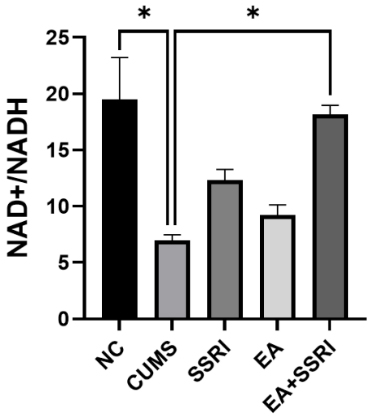 Mitochondrial dysfunction can also lead to the disappearance of synapses [58]. Mitochondria regulate the apoptotic machinery in cells, and abnormalities can lead to a reduction in synaptic protein synthesis and even the number of synapses [59]. In this experiment, transmission electron microscopy was used to observe the ultrastructure of mitochondria in hippocampal DG neurons to evaluate the effects of EA and EA combined with paroxetine intervention on the ultrastructure of neuronal mitochondria. We found that mitochondria in the hippocampal DG neurons of CUMS-induced depressive rats showed swelling, smaller size, decreased number of cristae, and vacuolization or focal-like cavitation. However, after intervention with paroxetine, EA, or EA combined with paroxetine, this process could be reversed, and EA combined with paroxetine intervention was more effective. To further evaluate changes in mitochondrial function, we also measured the NAD+/NADH ratio in the hippocampal DG of rats in each group to evaluate the effect of EA and EA combined with paroxetine intervention on mitochondrial NADH dehydrogenase. The results showed that EA combined with paroxetine intervention significantly increased the NAD+/NADH ratio, consistent with the transmission electron microscopy results. The concurrent improvement in depression-like behaviors, synaptic protein levels, and mitochondrial parameters following treatment suggests a potential mechanistic link. We hypothesize that the recovery of mitochondrial bioenergetics (elevated NAD+/NADH ratio and restored ultrastructure) may provide the necessary cellular substrate for the synthesis and stabilization of synaptic proteins like GluA1 and PSD-95. While this study demonstrates a strong association across these levels, future causal experiments are warranted to definitively link the specific elevation of GluA1 or NAD+/NADH to the reversal of synaptic ultrastructure damage. It is suggested that changes in the hippocampal mitochondrial pathway caused by EA combined with paroxetine intervention may be one of the important mechanisms underlying the efficacy of this intervention in depression, and that the mitochondrial pathway is an important upstream pathway for modulating synaptic efficacy in neurons [60].