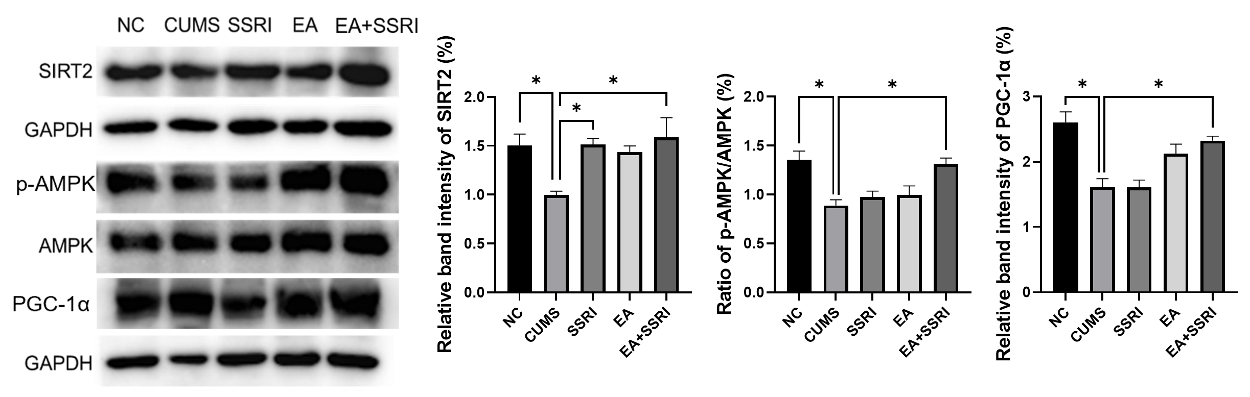 The results suggest that the therapeutic mechanism of EA combined with paroxetine is related to the regulation of the SIRT2/AMPAR pathway in the hippocampal DG of CUMS-induced depressive rats, which subsequently affects synaptic ultrastructure.