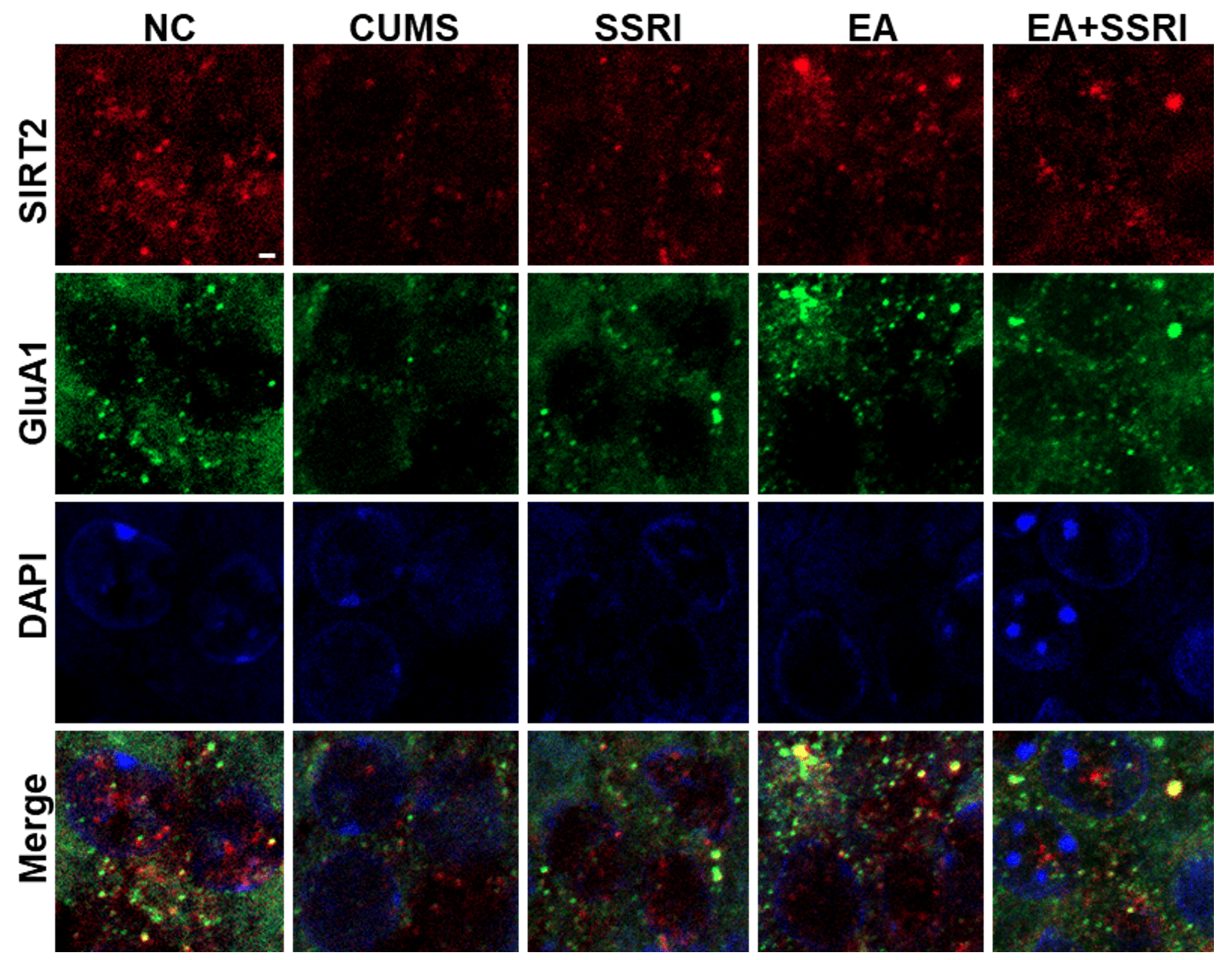 The immunofluorescence results for SIRT2 and GluA1 were consistent with the Western blot data and provided visual context for the protein interactions. Representative images revealed a strong immunofluorescence signal for both SIRT2 and GluA1 in the NC group, with their spatial distributions appearing highly overlapping. In the CUMS group, both signals were markedly attenuated, and the overlapping distribution was less apparent. The EA and EA+SSRI groups exhibited a restoration of signal intensity for both proteins, and their spatial distributions showed a notable degree of overlap, a trend that was most evident in the EA+SSRI group. The SSRI group showed restored signal intensity but a less apparent overlap in distribution compared to the EA-treated groups (Fig. 9).