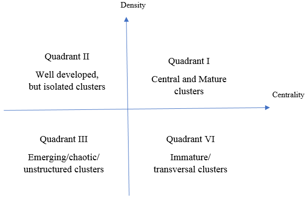 SNA is a method for studying social structures and relationships between nodes (Kumari et al, 2019). Several measures and metrics can be used in SNA, such as centrality and density (Isfandyari et al, 2023). In the SD, two axes show density and centrality: the x-axis indicates centrality, and the y-axis represents density. Consequently, the diagram is divided into four quadrants, displaying different degrees of centrality and density (Hu et al, 2013). A high level of centrality indicates that a cluster holds a more significant position within the field. As demonstrated in Fig. 1, the first quadrant consists of mature clusters situated at the center of the field due to their high levels of centrality and density. This means they exhibit strong internal correlations and maturity and have an extensive and robust relationship with other clusters. The second quadrant consists of well-developed but isolated clusters with low centrality and high density. It contains clusters that are not central but have progressed well. This suggests that these clusters are not pivotal but evolving. Clusters in the third quadrant have low centrality and low density, indicating emerging or declining themes with little attention. They display a relatively fragmented structure and are underdeveloped. Finally, the fourth quadrant comprises central clusters that are not yet developed. They have high centrality but low density and are immature due to their central position within the field (Hu et al, 2013; Khasseh et al, 2017).