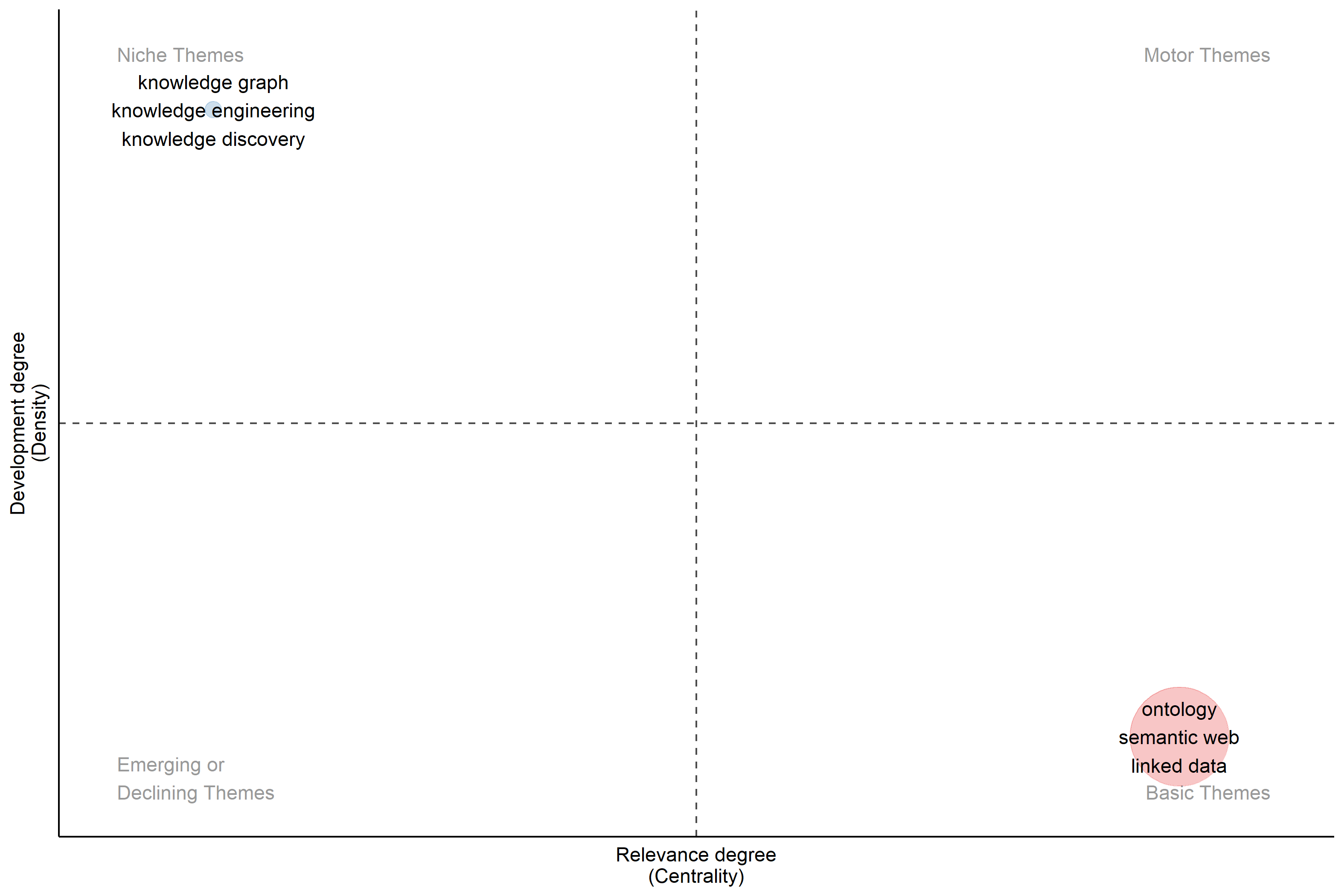 Themes located in Quadrant IV indicate basic themes due to high centrality and low density (Khasseh et al, 2017). Therefore, ‘ontology’, ‘semantic web’, and ‘linked data’ represented central but not developed clusters.