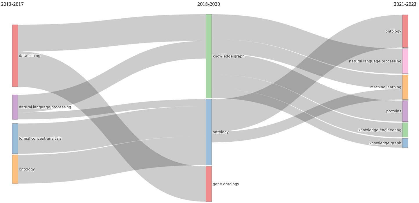 Sankey diagram of thematic evolution of the KG research field (2013–2023).