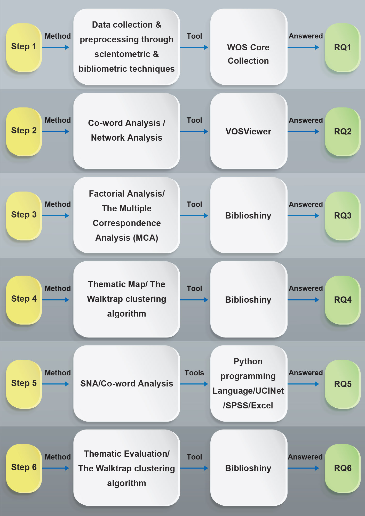 One way to create thematic maps or thematic evaluations is by using clustering algorithms, such as the Walktrap clustering algorithm, a hierarchical clustering algorithm used to identify communities or clusters within a network. It is based on the idea that connected nodes are more likely to belong to the same cluster than unconnected ones. The algorithm works by iteratively merging connected nodes until a desired level of clustering is achieved. Thematic maps can provide valuable insights into the spatial patterns and trends within a particular theme or topic (Brusco et al, 2022). Fig. 2 indicates the schematic methodology, including steps, methods, and tools.