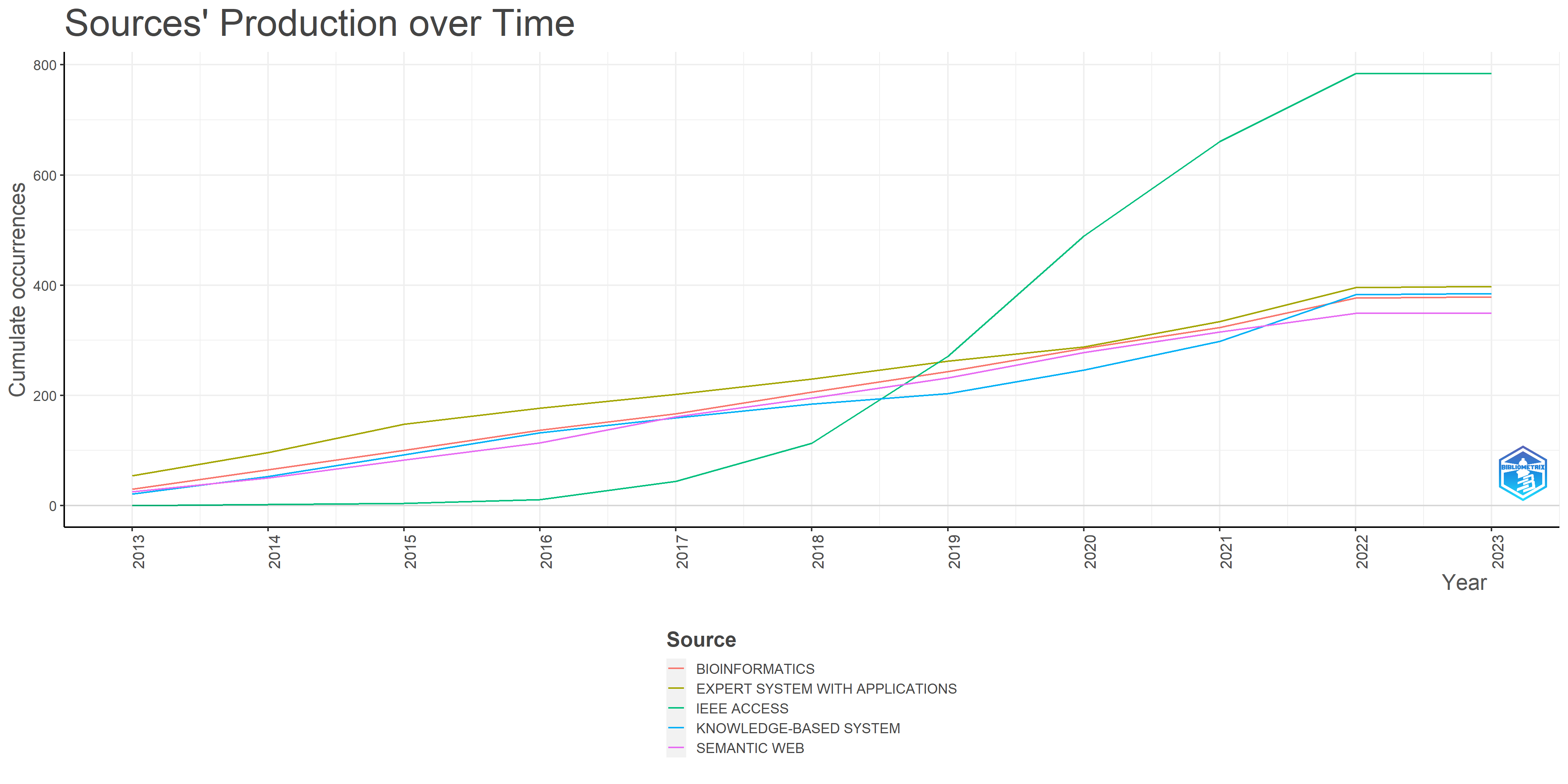 Between 2013 and 2023, an increase was observed in publications, particularly by IEEE Access, Expert System with Applications, Knowledge-Based System, Bioinformatics, and Semantic Web journals. Therefore, the journals have published a depth of knowledge and expertise on KGs and related subtopics. Fig. 4 depicts the sources’ publication over time.