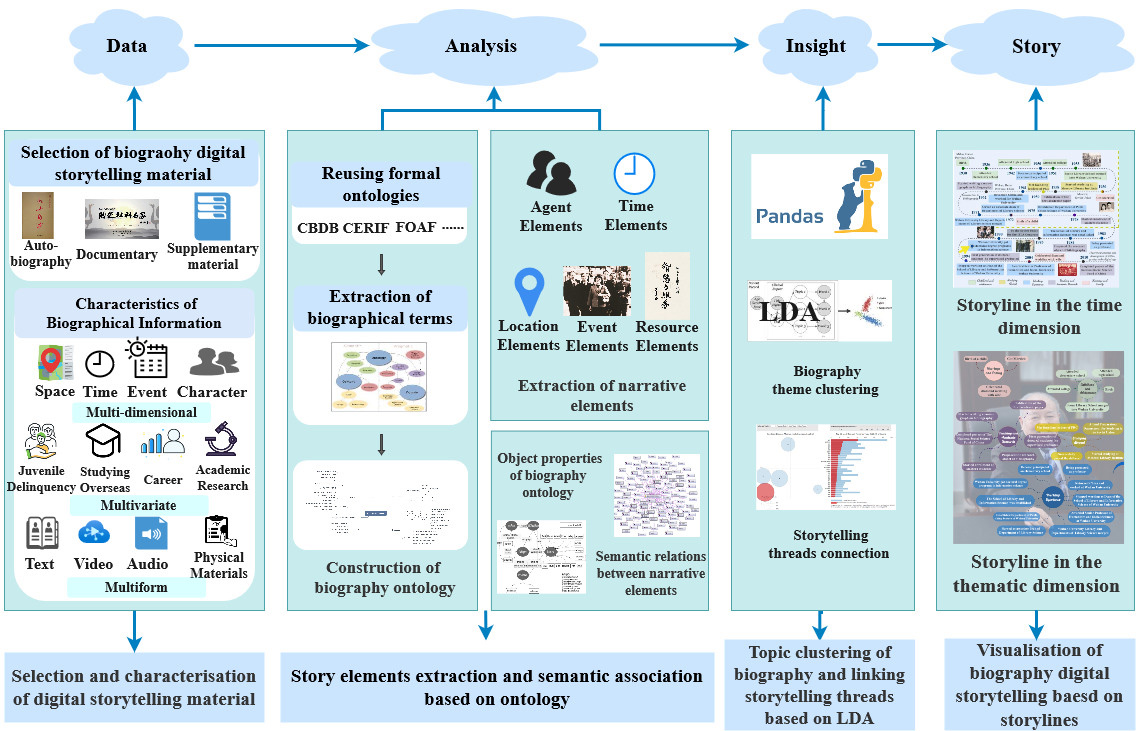 Since the 1990s, the “digital turn” in narratology has driven the emergence of digital storytelling (Wang and Zhao, 2024, pp. 30), a practice or method conveying narratives through digital technologies and media (Dupagne, 2010). Digital storytelling involves the integration, reconstruction, relation, and presentation of existing resources using digital tools such as semantic web and computational techniques and facilitates various modes of expression and dissemination using multimedia, enhancing interactivity and constructing digital memory (Fu et al, 2023, pp. 1523). Biography, as a documented account of individual experiences and a repository of social memory, provides a vivid subject matter for digital storytelling. Biography digital storytelling is inherently linked to the processing of biographical texts and historical documents, as well as the systematic organization and sequencing of storytelling elements, including characters, institutions, temporal settings, spatial contexts, and events. Knowledge organization through ontology can standardize and interrelate domain-specific knowledge, thus acting as a bridge between digital storytelling and biographies. Based on ontology, in conjunction with natural language processing (NLP) and visualization technology, this study employs the Autobiography of Library Scientist Peng Feizhang at the Age of Ninety (hereafter referred to as Autobiography) as an empirical case study. Drawing on narratology theory and grounded in the selection and analysis of storytelling materials, this study aims to extract and link storytelling elements through biography ontology, organize storytelling threads using Latent Dirichlet Allocation (LDA), and visually present biography digital storytelling via storylines. This approach aims to enhance the comprehensibility of biographical knowledge while exploring a methodological framework for implementing biography digital storytelling.
