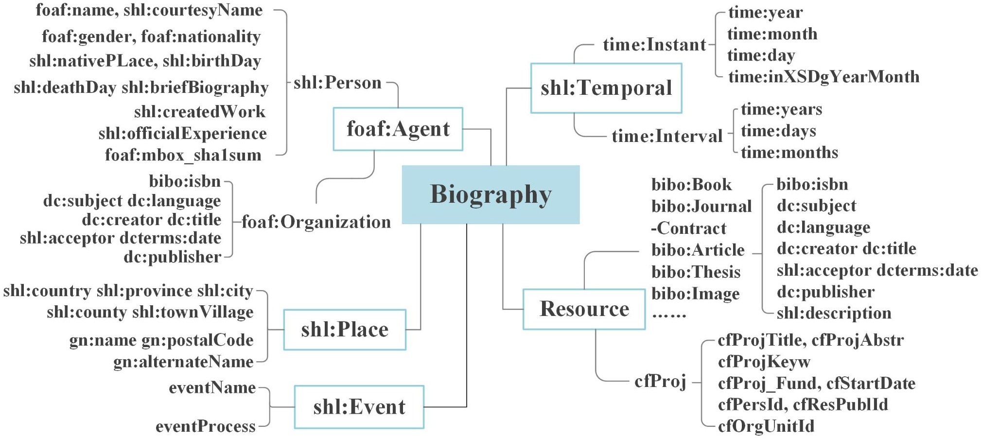 Ontology is a conceptual, semantic-level framework or a concrete artifact provided for a specific purpose (Guarino and Pierdaniele, 1995). It defines classes, properties, and relations among the members of classes that are relevant to model the knowledge of a domain (Gruber, 2009). This enables ontology to represent complex relationships between knowledge entities, integrate heterogeneous data resources, infer implicit knowledge, support knowledge integration, and enhance interoperability. Several studies have applied ontology to the knowledge organization of biography, mainly focusing on the construction principles and practical implementation of biography ontology.