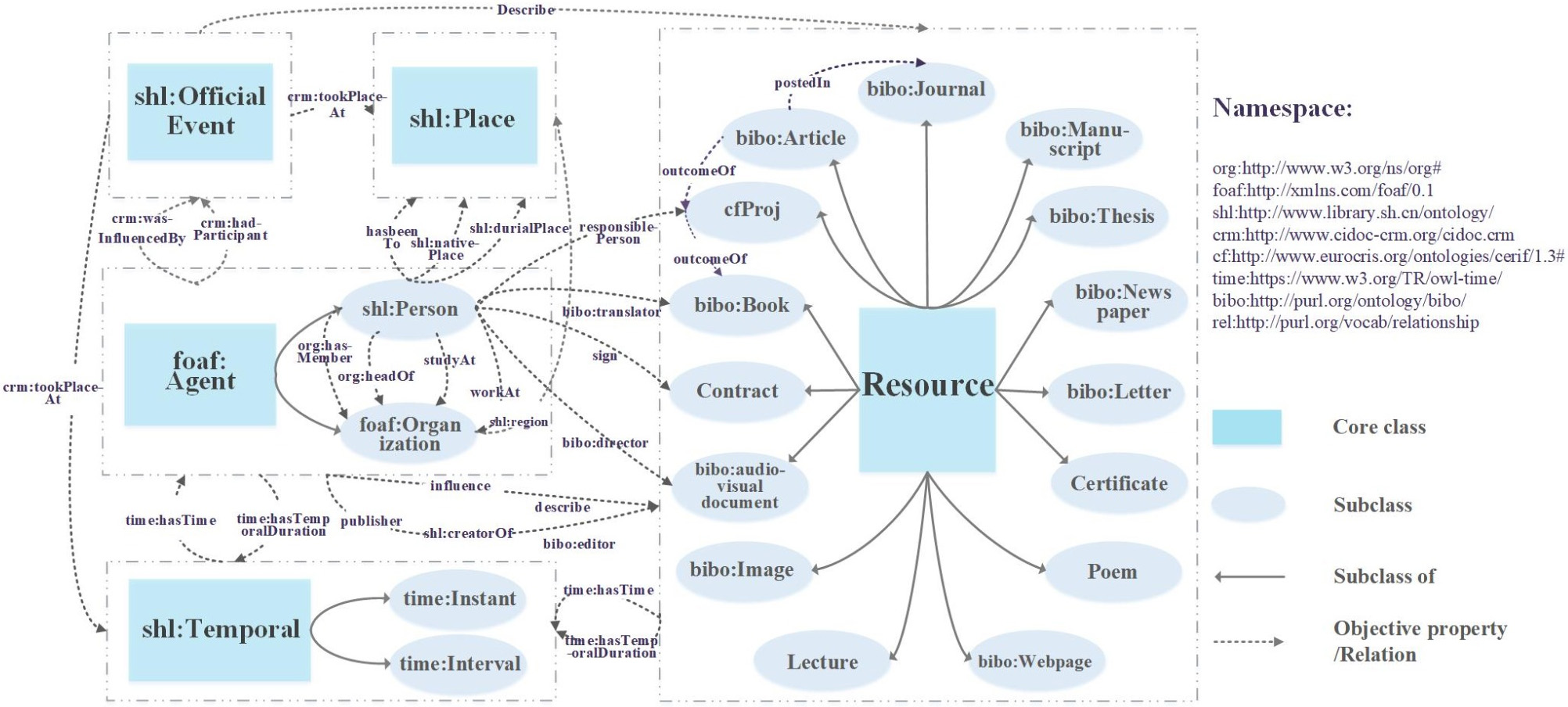 Third, investigate and search for existing ontologies that can describe biographical knowledge entities. CBDB establishes various relationships among knowledge entities in biographies, covering core concepts such as shl:Person, shl:OfficialEvent, shl:Temporal, and shl:Place. Consequently, we reused these core concepts in CBDB and identified people, organizations, time, space, events, and resources as core knowledge entities in the biography ontology.