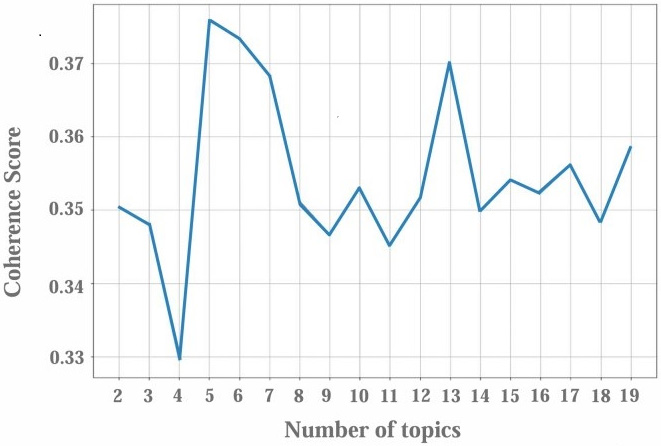 LDA is a generative probabilistic model of a corpus. The basic idea is that documents are represented as random mixtures over latent topics, where each topic is characterized by a distribution over words (Blei et al, 2003). By giving the topic probability distribution of each document in the corpus, LDA enables text mining, topic discovery and clustering. In this study, the data is stored as a corpus, which is preprocessed as described in Section 5.1.2 after data cleansing and segmentation. Each natural paragraph is treated as a separate document, resulting in a total of 1169 documents. The terms in the documents are converted into a word frequency matrix, and LDA is applied to model the topic distribution. The analysis yielded a different number of topic clustering results and their Coherence Score, as shown in Fig. 4.