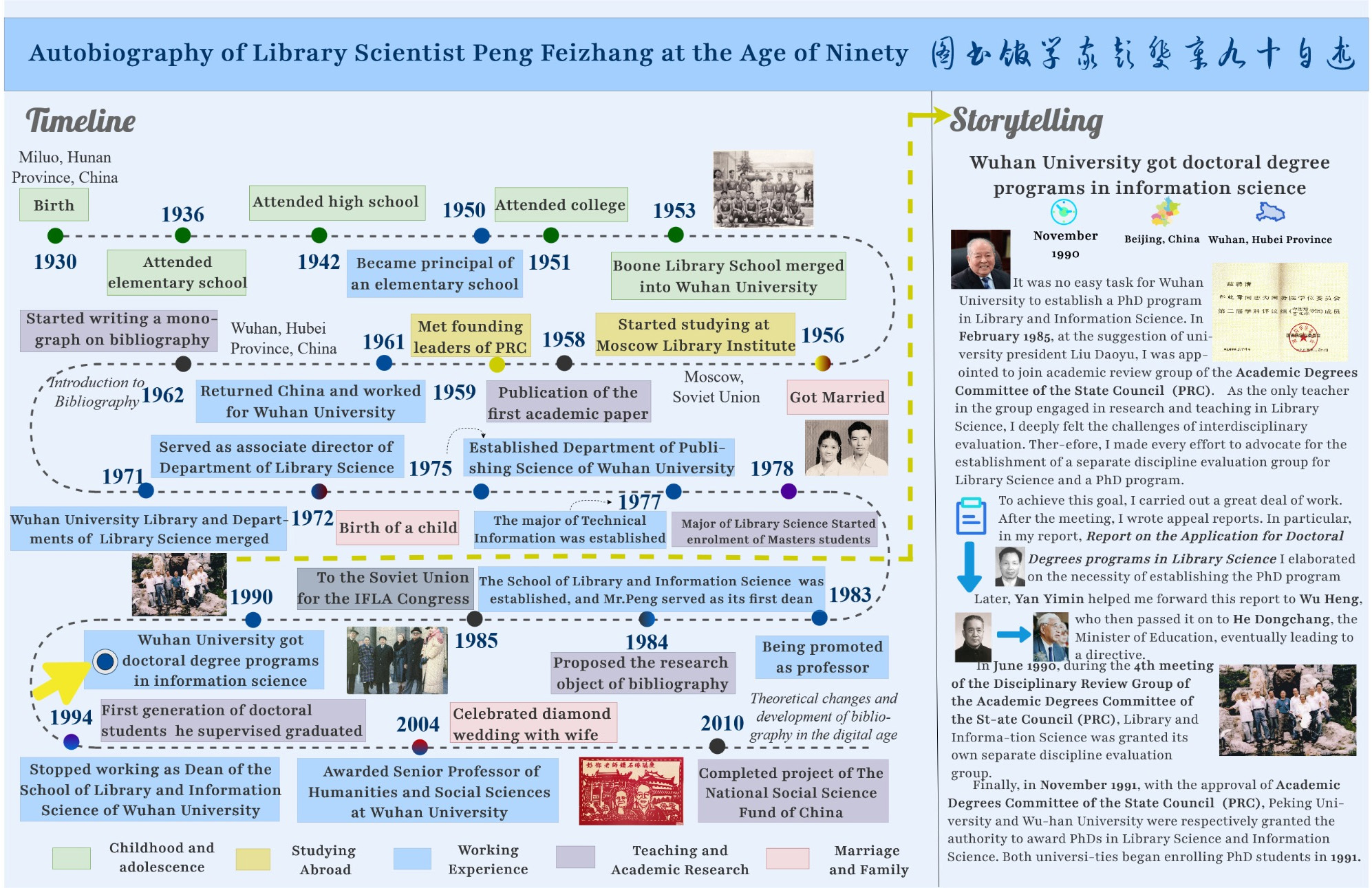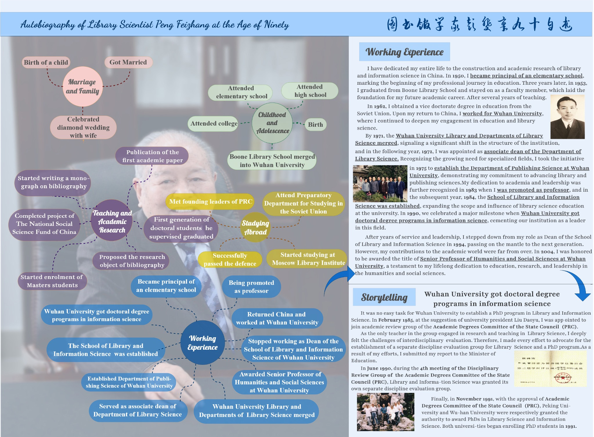 Peng Feizhang is widely recognized as a distinguished Chinese library scientist, educator, and bibliographer with significant contributions spanning several decades. Beginning his career as a junior academic during the early years of the People’s Republic of China, Peng later studied in the Soviet Union. Upon returning to China, he became the inaugural professor of library science, and subsequently held multiple pivotal roles, including serving as the first dean of China’s first School of Library and Information Science, the country’s first doctoral supervisor in information science, and the convener of the disciplinary review group of the State Council Academic Degrees Committee. Mr. Peng’s contributions have profoundly influenced the academic landscape and institutional development in library science.The digital storytelling of his Autobiography not only captures the development of Chinese librarianship but also serves as a valuable means of studying the history of library science education and promoting the ideals embodied by exemplary figures. With the publisher’s permission, the complete verbatim manuscript of the Autobiography was obtained and utilized in this study.