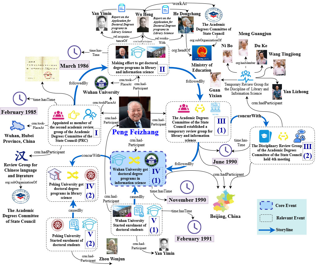 The storyline illustrated in Fig. 7 contains the following key events: In February 1985 (Phase I), Mr. Peng was appointed as a member of the Second Discipline Review Group of the Academic Degrees Committee of the State Council, and was assigned to the Chinese Language and Literature Group due to the lack of a separate review group for the discipline of library science, and thus he resolved to strive for a separate disciplinary review group and doctoral degree programs; In March 1986 (Phase II), he wrote The Report on the Application for Doctoral Degrees in Library Science, which was forwarded to Wu Heng at the Academic Degrees Committee via Yan Yimin, and then to the Minister of Education, He Dongchang, who provided a response. In June 1990 (Phase III), the Academic Degrees Committee of the State Council formed a distinct academic review group for library and information science (Phase III(1)) and held its fourth meeting in Beijing (Phase III(2)). During this meeting, Mr. Peng, along with six other experts—Ni Bo, Du Ke, Meng Guangjun, Guan Yixian, Yan Lizhong, and Wang Tingjiong—discussed key issues regarding master’s and doctoral programs in library and information science. In November 1990 (Phase IV(1)), with the approval of the Academic Degrees Committee of the State Council, Wuhan University was granted the right to offer doctoral programs in information science (Phase Ⅳ(1)), and Peking University was granted the right to offer doctoral programs in library science (Phase IV(2)). In 1991, Wuhan University commenced the enrollment of doctoral students in Information Science (Phase V). Fig. 7 links events chronologically and associates relevant storytelling elements through the classes and properties defined within the biography ontology.