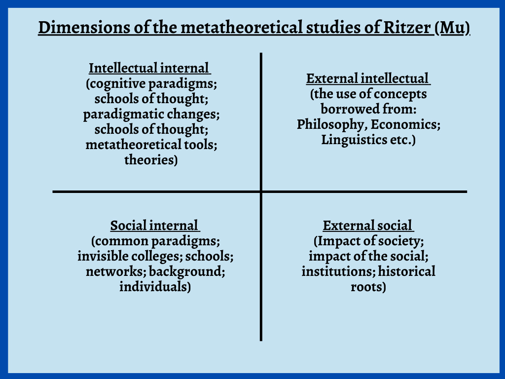 In the context of this research, it is acknowledged that Ritzer’s metatheoretical study model, designated as “Mu” (Fig. 1), is more appropriate for a comprehensive understanding of the Big Data context within Knowledge Organization. This model facilitates a profound comprehension of a theory, enabling a more expansive understanding through the following structure: