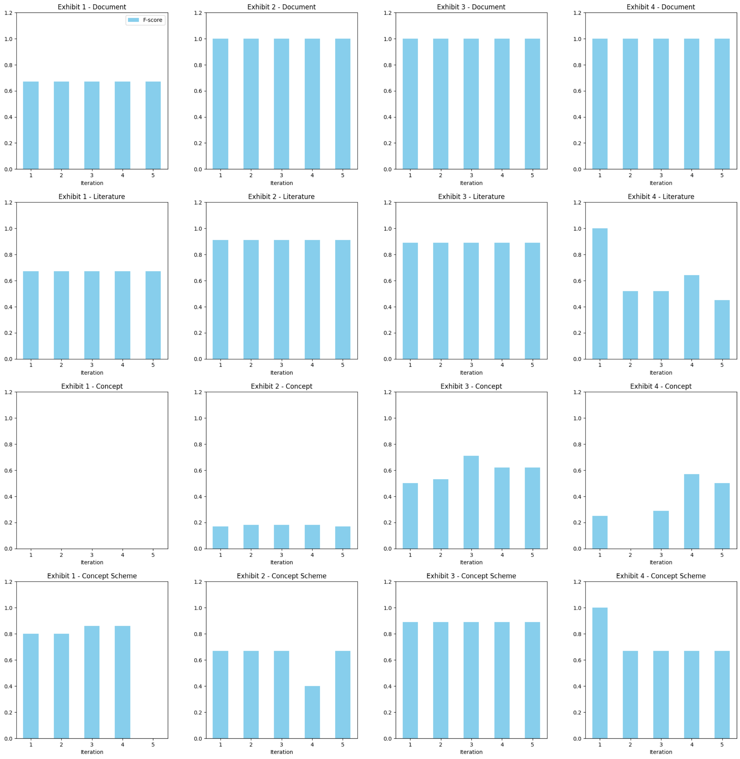 In the Document category, in every iteration across all Exhibits, ChatGPT performed extremely well in terms of consistency, repeating the exact same answers in all instances. Despite lower recall, resulting in a lower overall F1-score, the five iterations for Exhibit 1 remained consistent. For Literature, consistency was maintained in three Exhibits. Though the recall in the three cases did not equal 1, every iteration of these three exhibits produced the same answers. For Exhibit 4, consistency was not achieved; only two of five iterations produced the same answers. For Concept Scheme, consistency was achieved perfectly in Exhibit 3. In Exhibit 2 and Exhibit 4, four of five iterations produced the same answers with ChatGPT. For Exhibit 1, two pairs of iterations produced the same answers. For Concept, there was a lack of consistency across iterations for all four exhibits. There was some limited consistency for Concept in Exhibit 2; otherwise, the Concept category has proven to be the most challenging in terms of consistency.