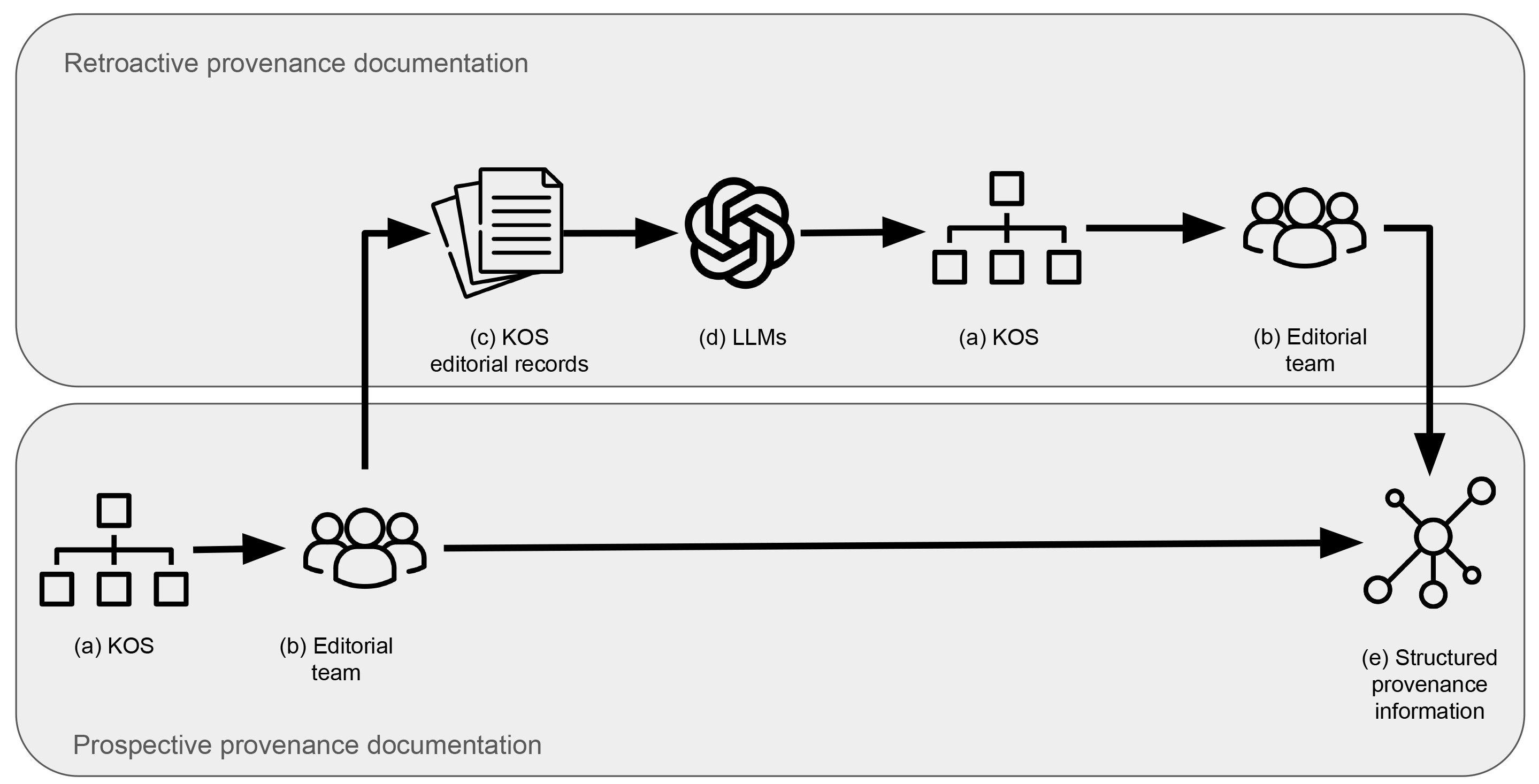 To retrieve any meaningful information from KOS editorial records, the records themselves must be in a sufficiently structured format. Extant efforts have focused on extending the use of provenance models such as PROV (https://www.w3.org/TR/prov-overview/) in metadata descriptions (Li and Sugimoto, 2018) or applying PROV to classifications in Linked Open Data formats (Lodi et al, 2014), so that descriptions can be more effectively structured. Other group efforts, like the Simple Knowledge Organization Systems (SKOS), support structured properties such as changeNote or editorialNotes (Isaac and Summers, 2009). Our prior work focuses on obtaining provenance information in a structured, ontology-compliant format that supports efficient provenance retrieval (Choi and Cheng, 2025). We model the change activities a KOS takes and suggest elements and attributes to document changes in a structured format. However, existing efforts and our own prior work mostly rely on KOS editorial teams’ awareness of the model and their willingness to adopt the structured formats in their future updates to the KOSs. Editorial notes from the past that must be retroactively documented often remain buried in digital repositories.