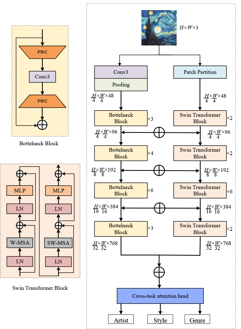 In this section, we present the architecture of the proposed Convolution-Transformer Hybrid Attention model (CTHArt) for joint artist, style, and genre classification in fine art paintings. The primary goal of our design is to unify local texture learning and global semantic modeling within a single, end-to-end trainable backbone. To achieve this, we construct a dual-branch network composed of a CNN stream and a ViT stream, as shown in Fig. 2. The CNN branch provides strong locality and texture inductive biases, reducingthe burden on the Transformer to learn low-level visual structures from limited data. The Transformer branch thus focuses on modeling long-range semantic dependencies, improving representational efficiency under data-constrained settings. The CNN branch is based on the ResNet-50 architecture, while the Transformer branch adopts the Swin Transformer framework. Both branches are carefully synchronized in terms of feature map resolution and channel dimensions, enabling effective fusion and interaction across stages. Furthermore, the entire backbone is shared among the multiple classification tasks, which facilitates joint feature representation and captures the intrinsic relationships between artistic attributes.