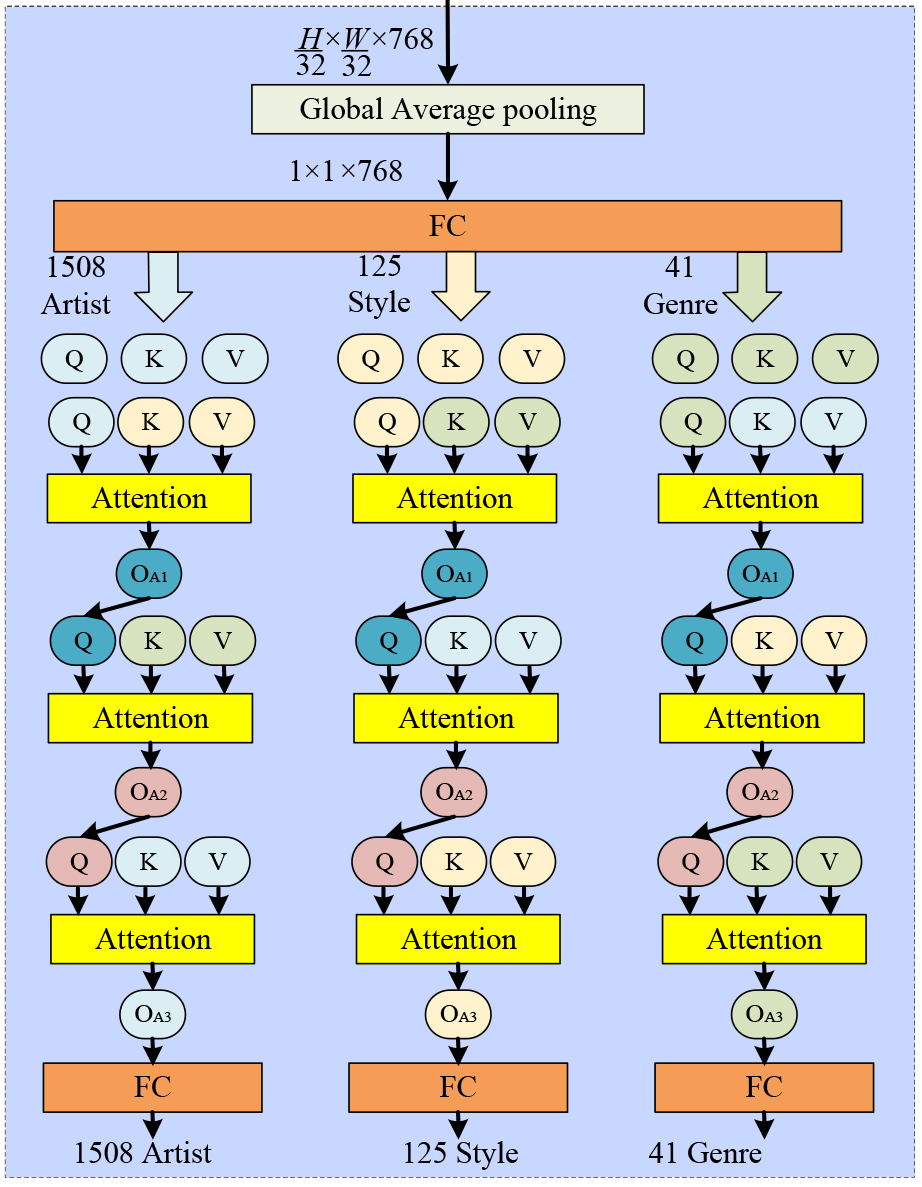 This hierarchical attention structure is mirrored for the style and genre heads, with each task attending to the others in a cyclic order. Through this cross-task attention, the decoder heads dynamically exchange semantic information, capturing interdependencies among artistic attributes. This design enhances prediction performance by allowing the network to exploit subtle correlations across tasks, such as stylistic indicators that hint at an artist’s identity or genre-related elements that inform stylistic decisions.