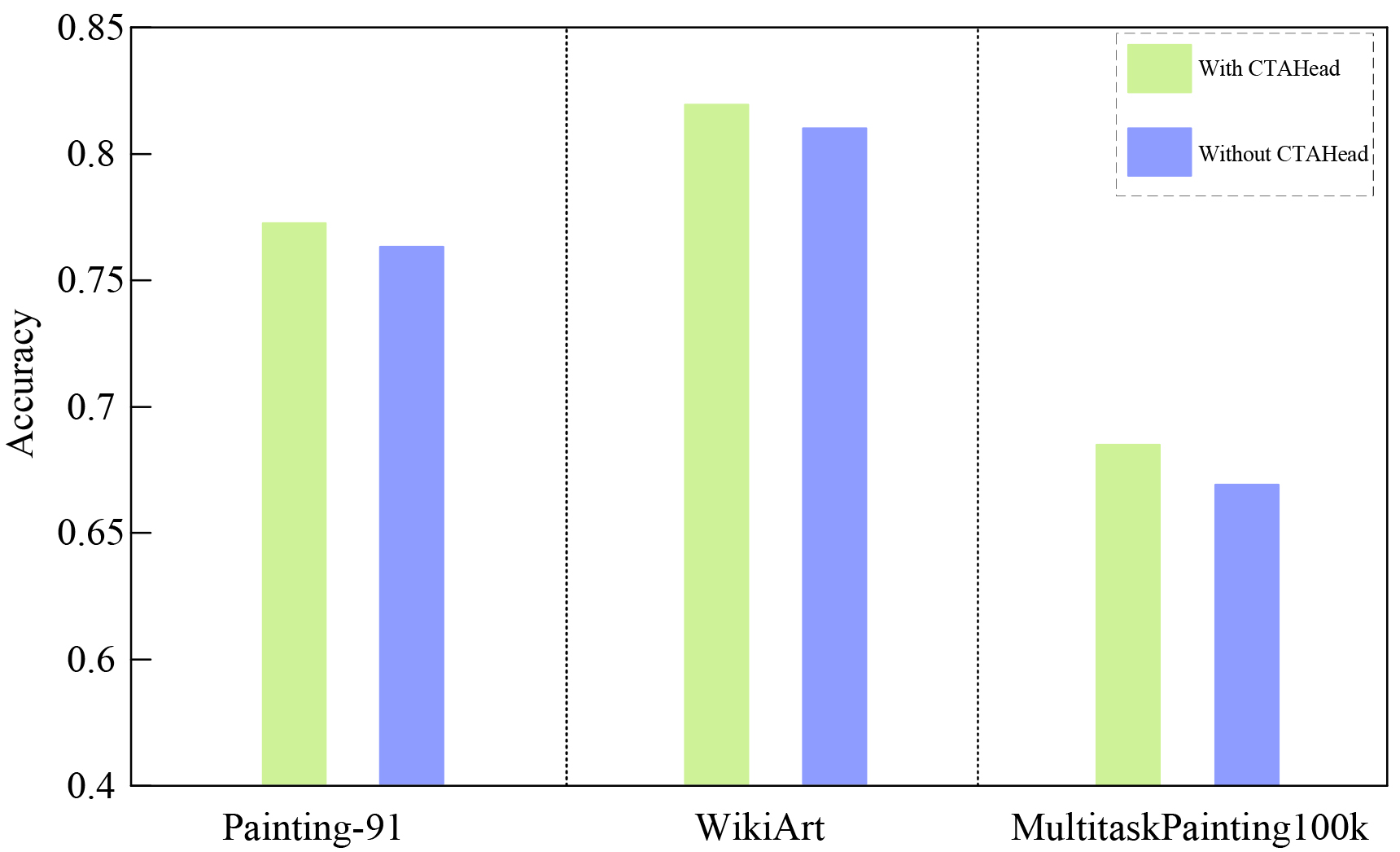 To better understand the contribution of the proposed CTAHead, we conduct an ablation study by comparing the full CTHArt model with a reduced variant where the CTAHead is removed. In the ablated model, the global feature vector obtained from the backbone is directly passed to three independent fully connected layers for artist, style, and genre classification, without any task interaction or attention-based reasoning. All other components (hybrid backbone, training protocols) remain identical. As shown in Fig. 4, the mean accuracy was improved by more than 1% on three datasets, with the help of CTAHead.