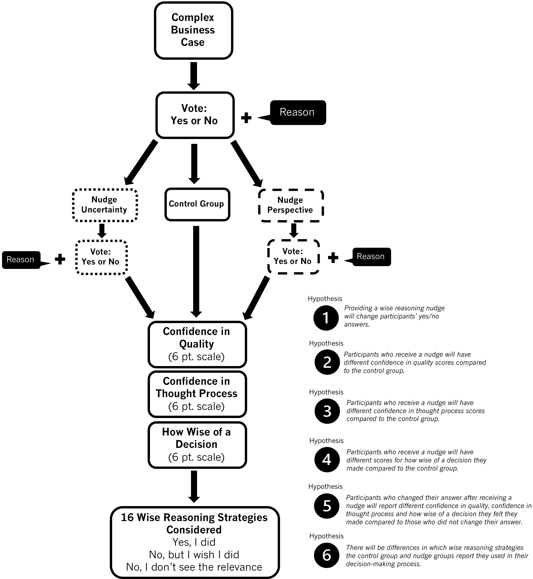 Fig. 1. Survey Design and Hypotheses for Nudges for Wise Reasoning Strategies.