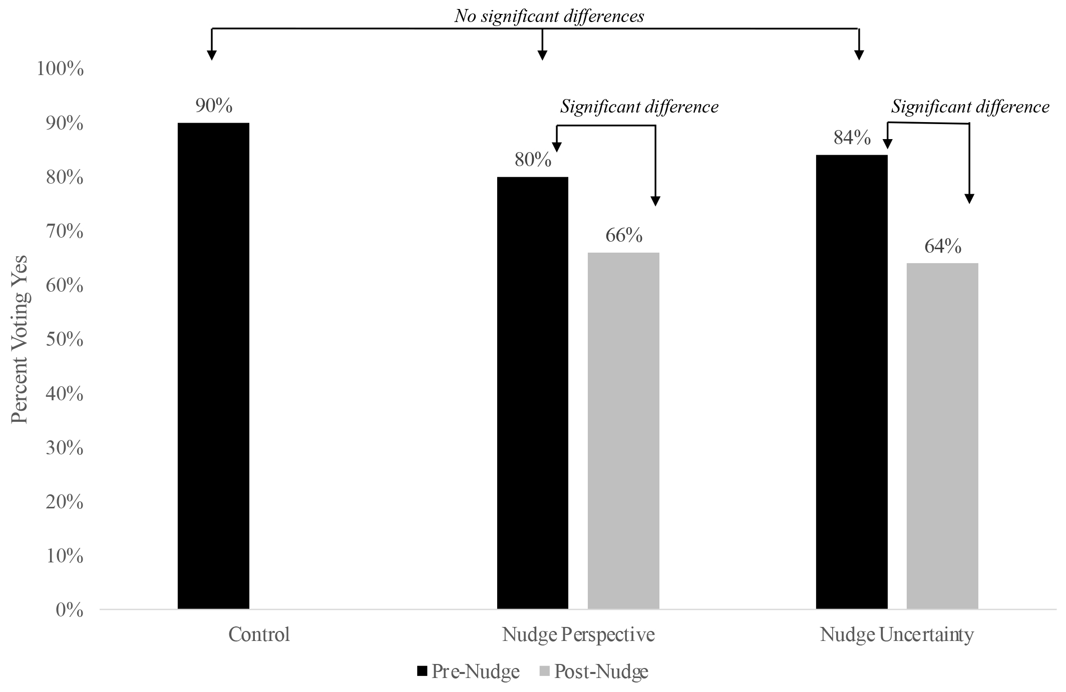 Fig. 2. Percent Voting “Yes” Pre- and Post-Nudge by Group.