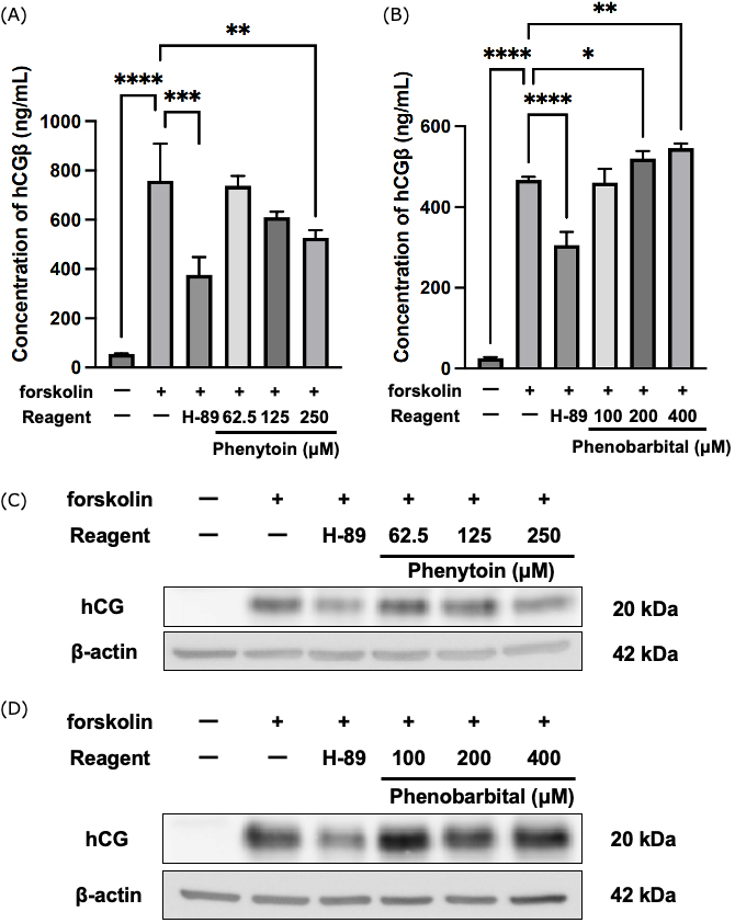 Evaluation of cell fusion showed that phenytoin significantly suppressed forskolin-induced luciferase activity, whereas phenobarbital did not. Enzyme-linked immunosorbent assay showed that the concentration of human chorionic gonadotropin beta (hCGβ) in the cell culture supernatant was decreased in phenytoin-treated syncytialized BeWo cells but increased in phenobarbital-treated cells. Western blotting also showed a similar pattern in the hCG protein expression level.