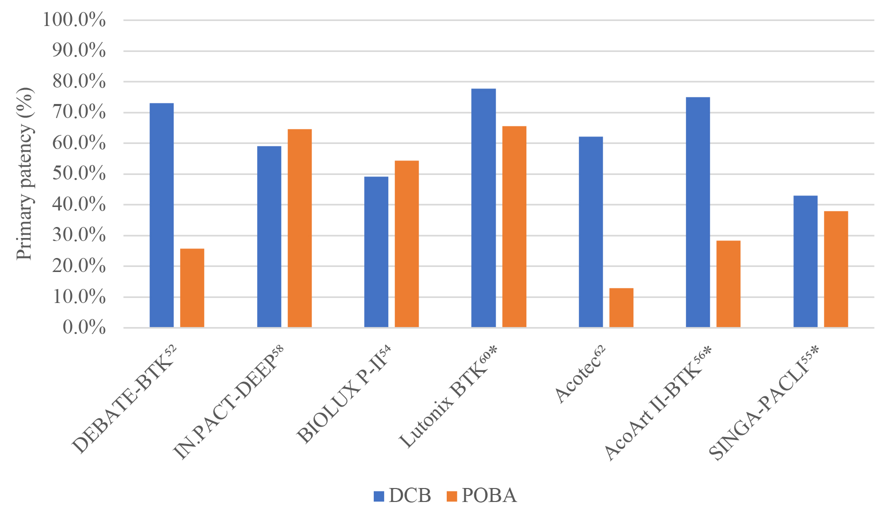 Fig. 1.Comparison of 12-month primary patency in DCB vs. POBA clinical trials. *, primary patency at 6 months.