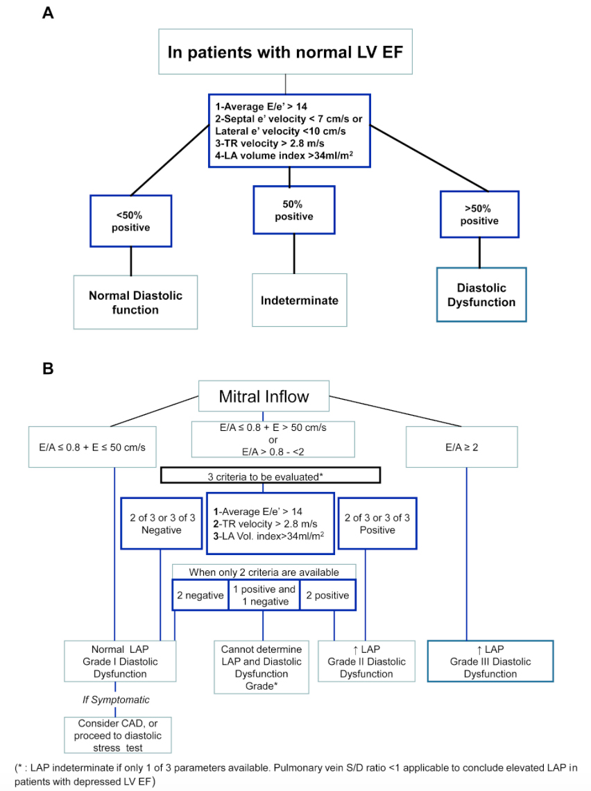 Fig. 1.Algorithm for diagnosis of LV pressures and diastolic dysfunction in: (A) patients with normal LVEF (B) patients with depressed LVEF and, patients with myocardial disease and normal LVEF after consideration of clinical and other 2D data [45] (reprinted with permission from © Elsevier).