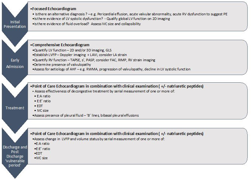 Fig. 2.Flowchart suggesting how echocardiogram could be utilised in each stage of AHF to improve patient outcomes.