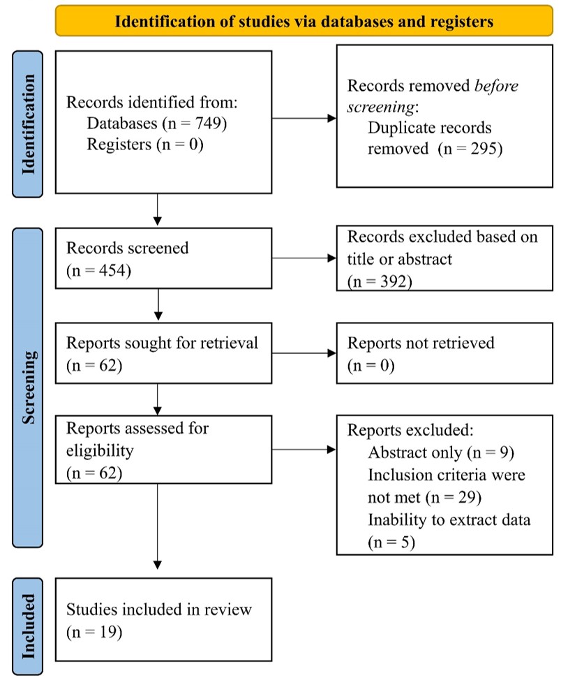 Our endeavor in the prespecified databases retrieved 749 citations. After excluding duplicate references and citations based on title or abstract evaluation, 62 studies were left for eligibility assessment. Of the screened studies, 19 met the inclusion criteria and were included in our systematic review. The search and screening process were reported in Fig. 1.