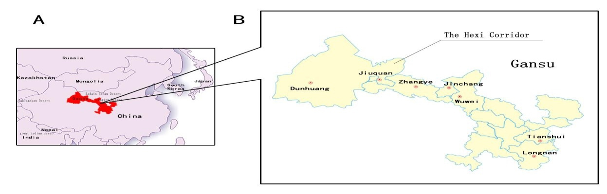 Fig. 1.Maps of China and Gansu province, the Hexi Corridor. (A) Location of Gansu Province in China. (B) Location of Hexi Corridor in Gansu Province.