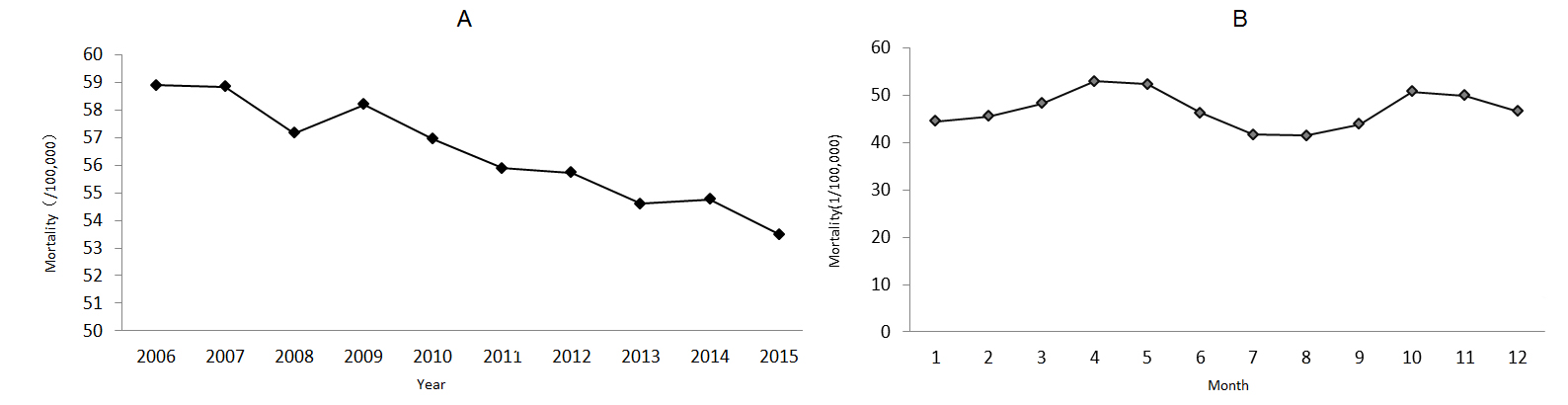 Fig. 2.The trend distribution by time. (A) Trend distribution of CHD mortality rate in Hexi Corridor from 2006 to 2015. (B) Monthly Trend distribution of CHD mortality rate in Hexi Corridor from 2006 to 2015.