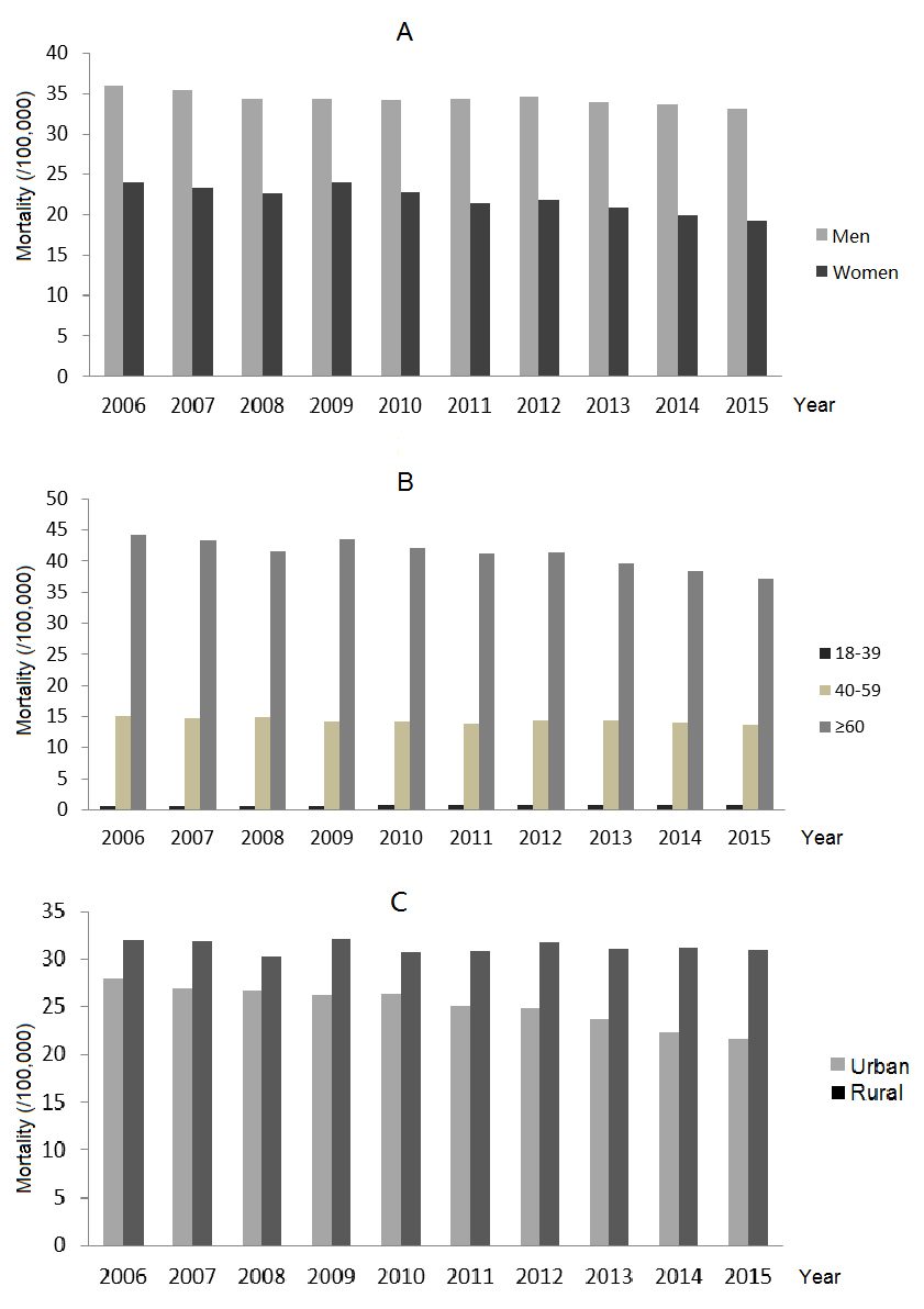 Fig. 3.The subgroup analysis by gender, age and area. (A) The sex distribution of CHD mortality rate in Hexi Corridor from 2006 to 2015. (B) The age distribution of CHD mortality rate in Hexi Corridor from 2006 to 2015. (C) The area distribution of CHD mortality rate in Hexi Corridor from 2006 to 2015.