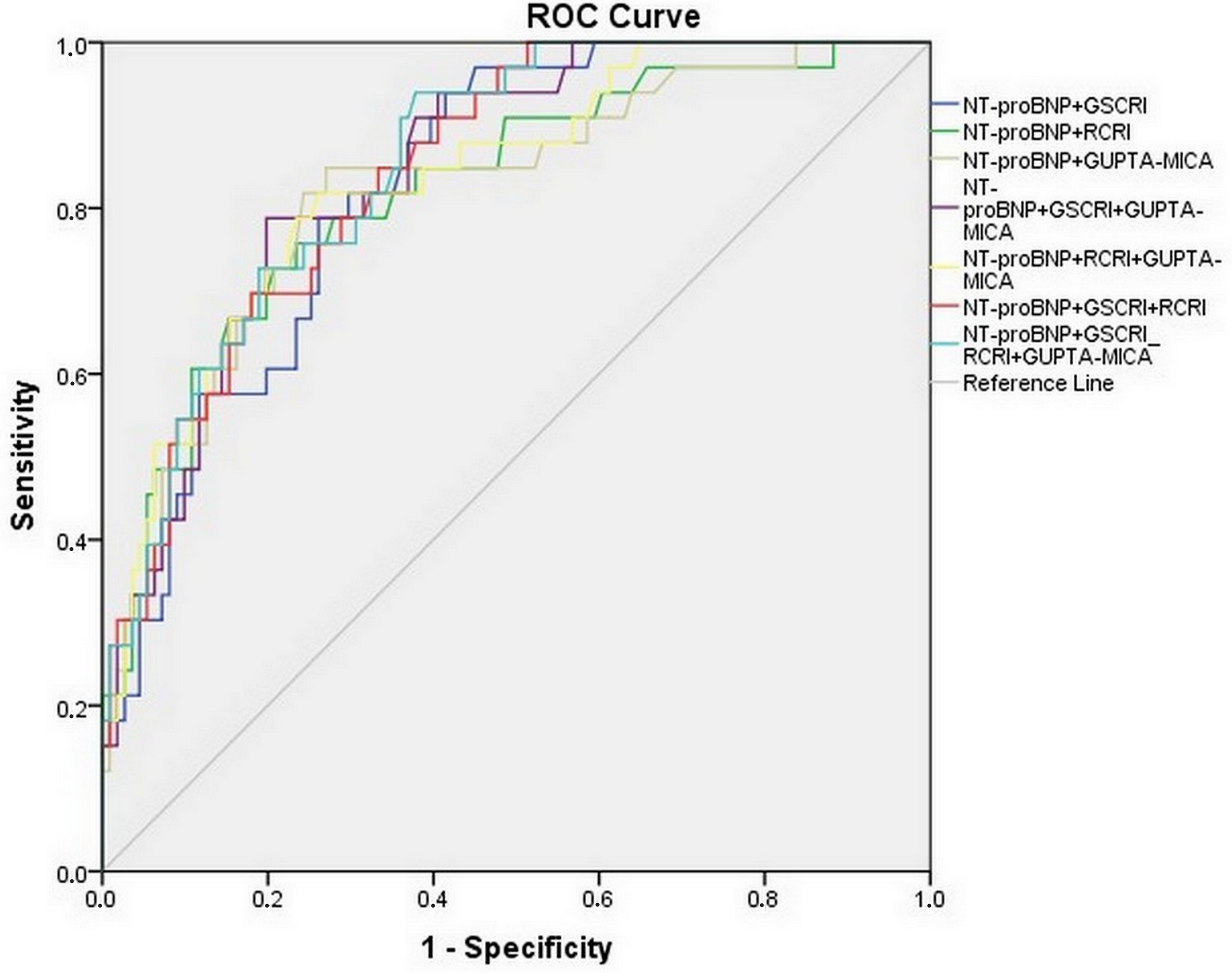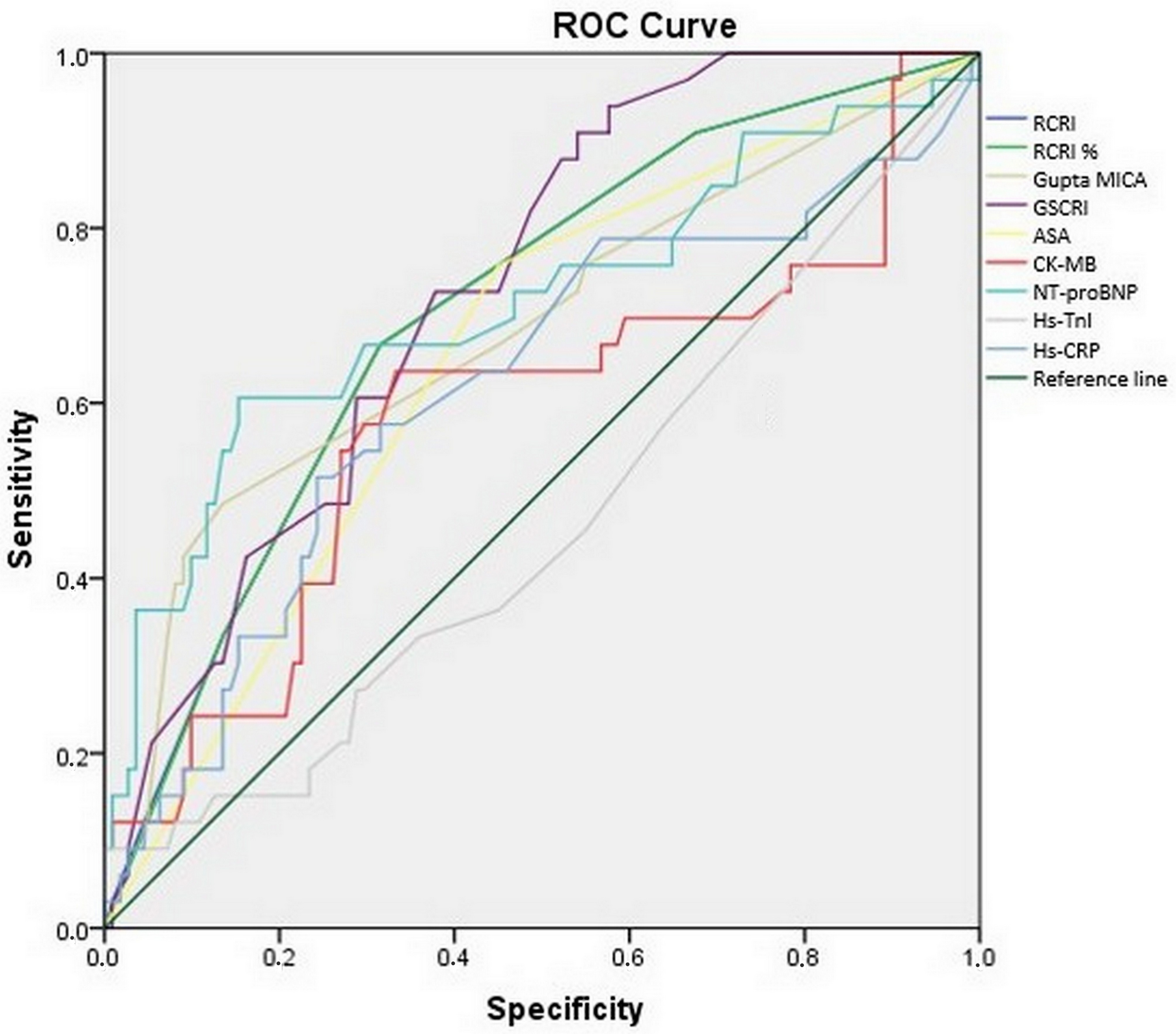 Fig. 1.Individual discriminative ability of risk scores and biomarkers. The receiver operating characteristic (ROC) curve illustrates the discriminative ability of four biomarkers and four risk scores. Abbreviations: ROC, receiver operating characteristic; RCRI, Revised Cardiac Risk Index; MICA, myocardial infarction and cardiac arrest; GSCRI, Geriatric-Sensitive Cardiac Risk Index; ASA, American Society of Anesthesiologist; CK, creatine kinase - MB isoenzyme; NT-proBNP, N-terminal fragment of pro-B-type natriuretic peptide; Hs-TnI, High-sensitivity troponin I; Hs-CRP, high-sensitivity C-reactive protein.