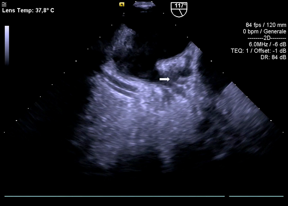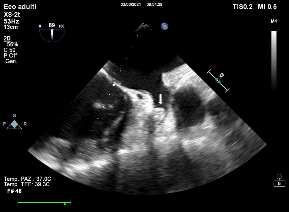 Fig. 3.The main TOE e/o CCTA exclusion criterion is the existence of thrombus in the LAA (see arrow).
