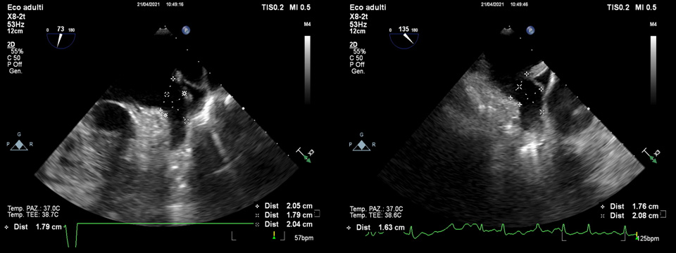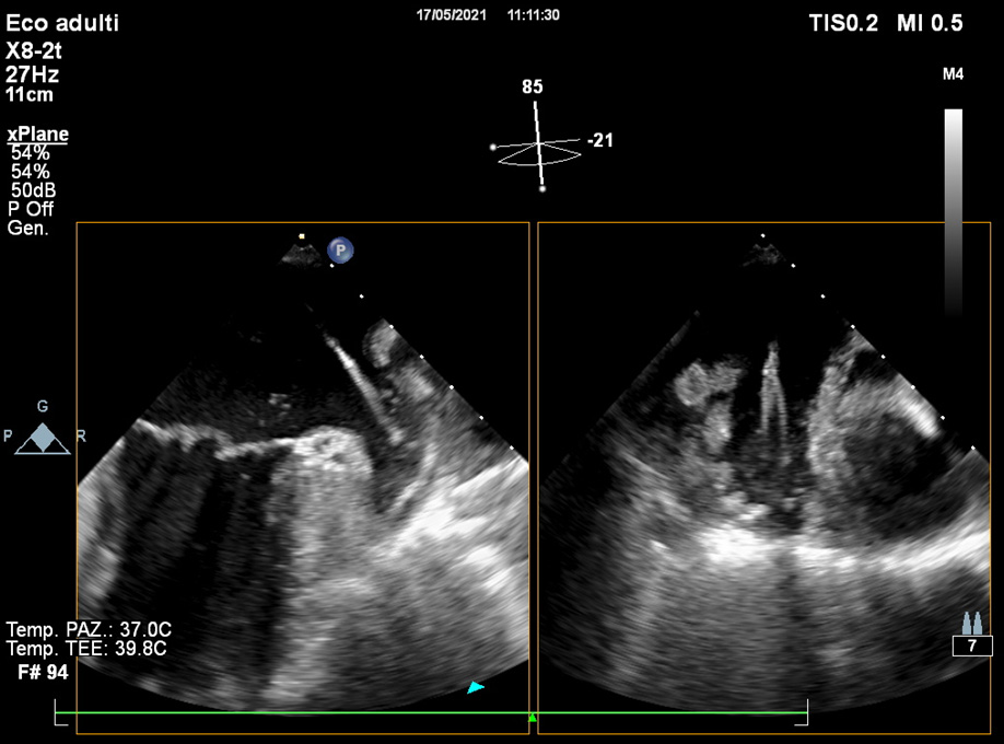 Fig. 6.Intra-operative TOE monitoring. After the transeptal puncture, a wire is passed into the left atrium and typically positioned in the left superior pulmonary vein and after into the LAA.