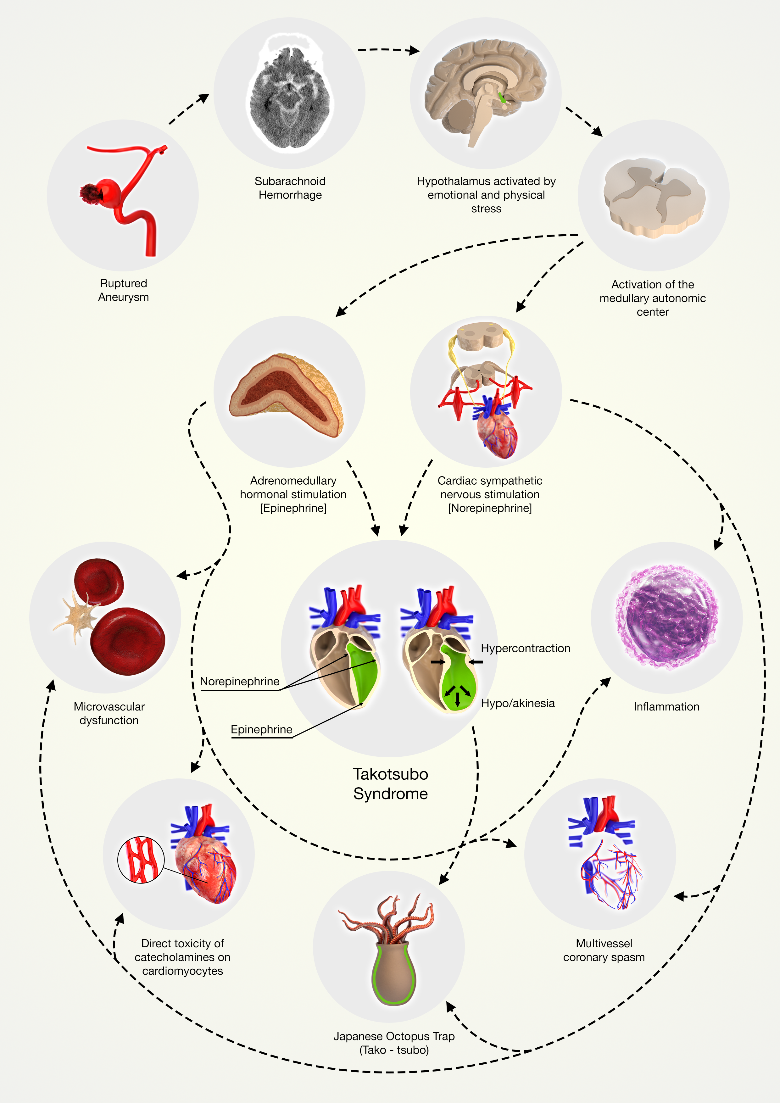 In addition to emotional stress, severe brain damage is also described as a possible trigger. While ischemic stroke, cranial trauma, and intracerebral hemorrhage are less frequently encountered, aneurysmal subarachnoid hemorrhage (aSAH) is described as an immediate cause in up to 28% of the cases [4].