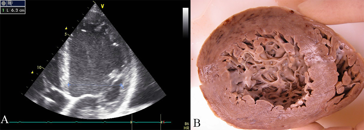 Fig. 1.Echocardiographic and pathoanatomic picture of left ventricular hypertrabeculation/noncompaction. (A) Echocardiographic apical four-chamber-view of a patient with dilated cardiomyopathy. Four trabeculations are visible in the apex of the left ventricle, thus fulfilling the criteria of Stöllberger et al. [10] for left ventricular hypertrabeculation/noncompaction. (B) One week after echocardiography, the patient died due to heart failure. The formaldehyde-fixed heart is opened along the short axis. A heavily trabeculated apical portion of the left ventricle is visible.